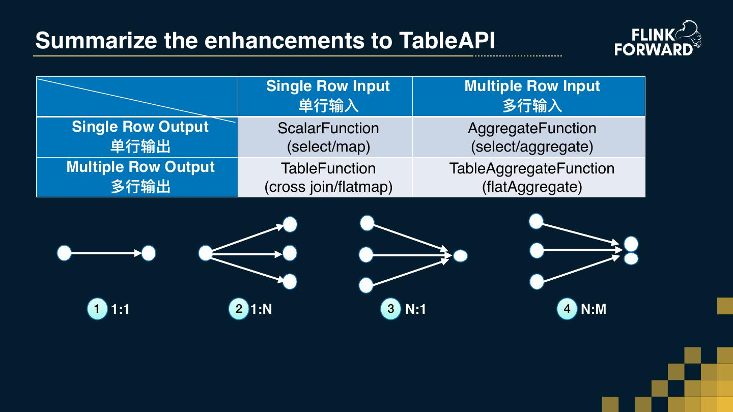 25 .Summarize the enhancements to TableAPI Single Row Input Multiple Row Input 单⾏行行输⼊入 多⾏行行输⼊入 Single Row Output ScalarFunction AggregateFunction 单⾏行行输出 (select/map) (select/aggregate) Multiple Row Output TableFunction TableAggregateFunction 多⾏行行输出 (cross join/flatmap) (flatAggregate) 1 1:1 2 1:N 3 N:1 4 N:M