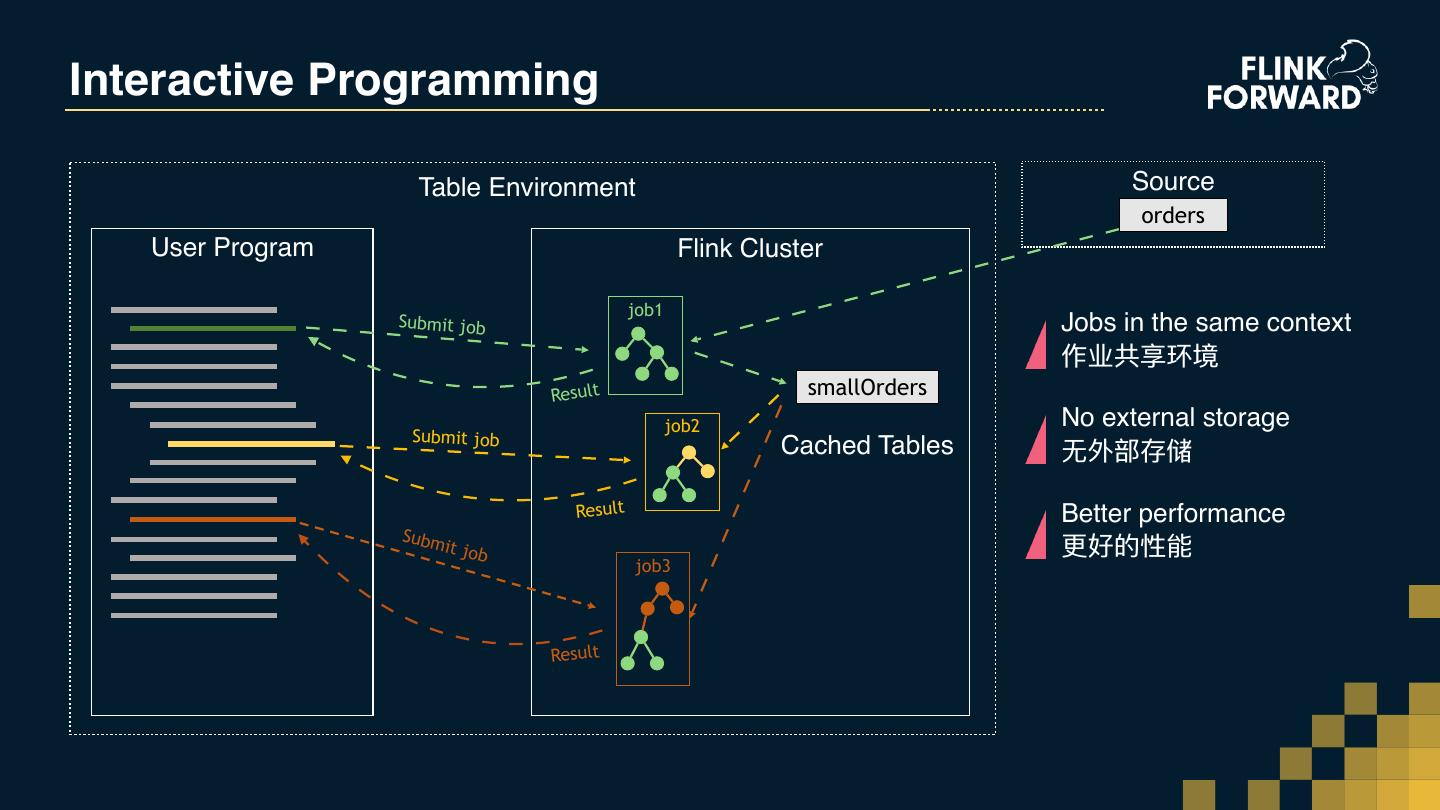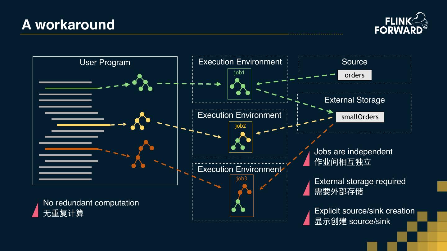 29 .A workaround User Program Execution Environment Source job1 orders External Storage Execution Environment smallOrders job2 Jobs are independent 作业间相互独⽴立 Execution Environment job3 External storage required 需要外部存储 No redundant computation ⽆无重复计算 Explicit source/sink creation 显示创建 source/sink