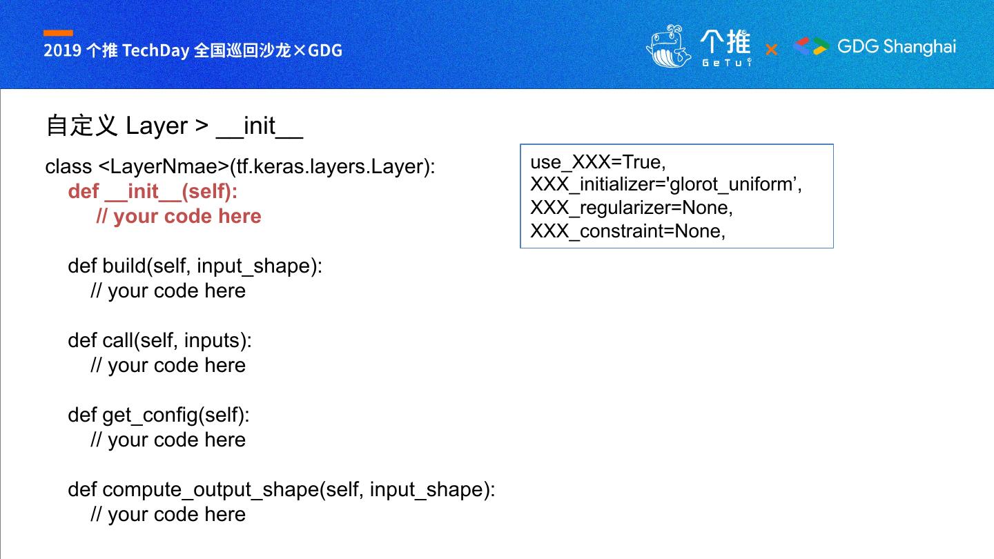 21 .自定义 Layer > __init__ class <LayerNmae>(tf.keras.layers.Layer): use_XXX=True, def __init__(self): XXX_initializer='glorot_uniform’, // your code here XXX_regularizer=None, XXX_constraint=None, def build(self, input_shape): // your code here def call(self, inputs): // your code here def get_config(self): // your code here def compute_output_shape(self, input_shape): // your code here