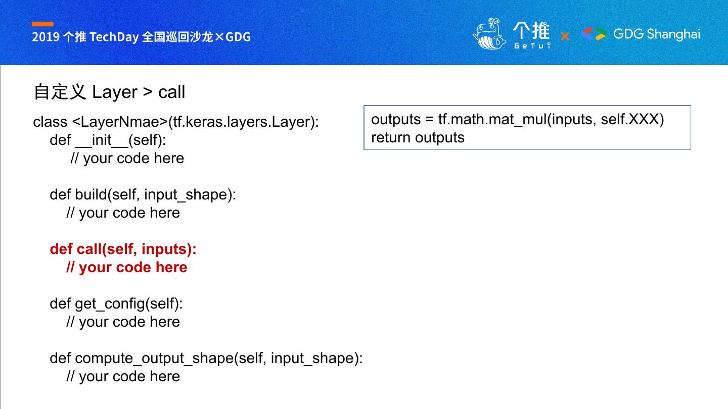 24 .自定义 Layer > call class <LayerNmae>(tf.keras.layers.Layer): outputs = tf.math.mat_mul(inputs, self.XXX) def __init__(self): return outputs // your code here def build(self, input_shape): // your code here def call(self, inputs): // your code here def get_config(self): // your code here def compute_output_shape(self, input_shape): // your code here