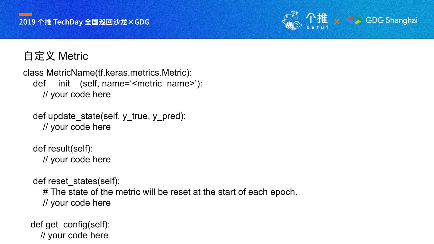 28 .自定义 Metric class MetricName(tf.keras.metrics.Metric): def __init__(self, name=‘<metric_name>’): // your code here def update_state(self, y_true, y_pred): // your code here def result(self): // your code here def reset_states(self): # The state of the metric will be reset at the start of each epoch. // your code here def get_config(self): // your code here