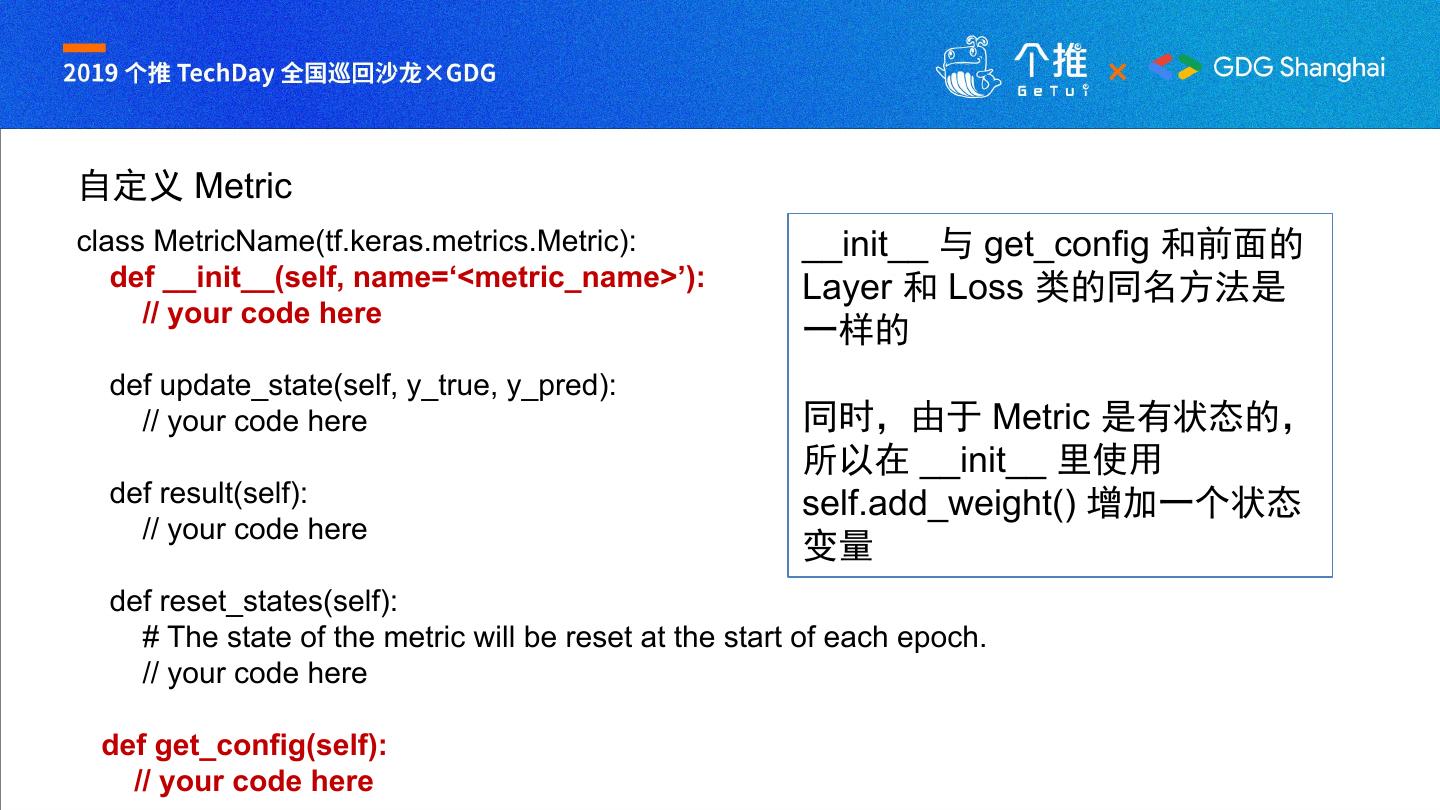 29 .自定义 Metric class MetricName(tf.keras.metrics.Metric): __init__ 与 get_config 和前面的 def __init__(self, name=‘<metric_name>’): Layer 和 Loss 类的同名方法是 // your code here 一样的 def update_state(self, y_true, y_pred): // your code here 同时,由于 Metric 是有状态的, 所以在 __init__ 里使用 def result(self): self.add_weight() 增加一个状态 // your code here 变量 def reset_states(self): # The state of the metric will be reset at the start of each epoch. // your code here def get_config(self): // your code here