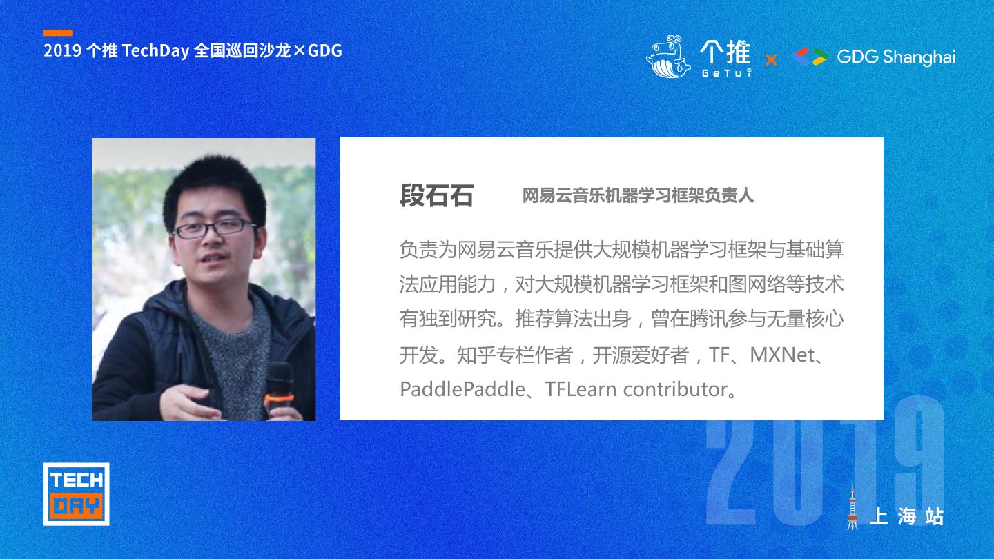 段石石,五年互联网从业经验,开源爱好者,TF、MXNet、PaddlePaddle、TFLearn contributor,知乎专栏作者,推荐算法出身,因在腾讯工作期间参与无量核心开发,由算法转ML SYSTEM。目前就职于网易云音乐,负责云sa音乐整体机器学习框架的应用于研发,为云音乐提供大规模机器学习框架与基础算法应用能力,目前的兴趣点在大规模机器学习框架、图网络等。