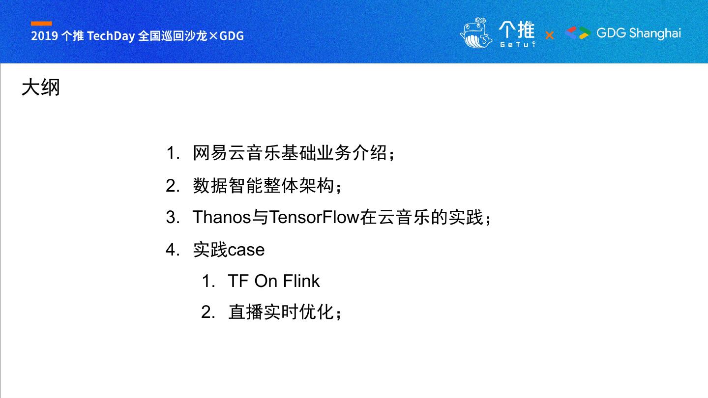 6 .大纲 1. 网易云音乐基础业务介绍; 2. 数据智能整体架构; 3. Thanos与TensorFlow在云音乐的实践; 4. 实践case 1. TF On Flink 2. 直播实时优化;