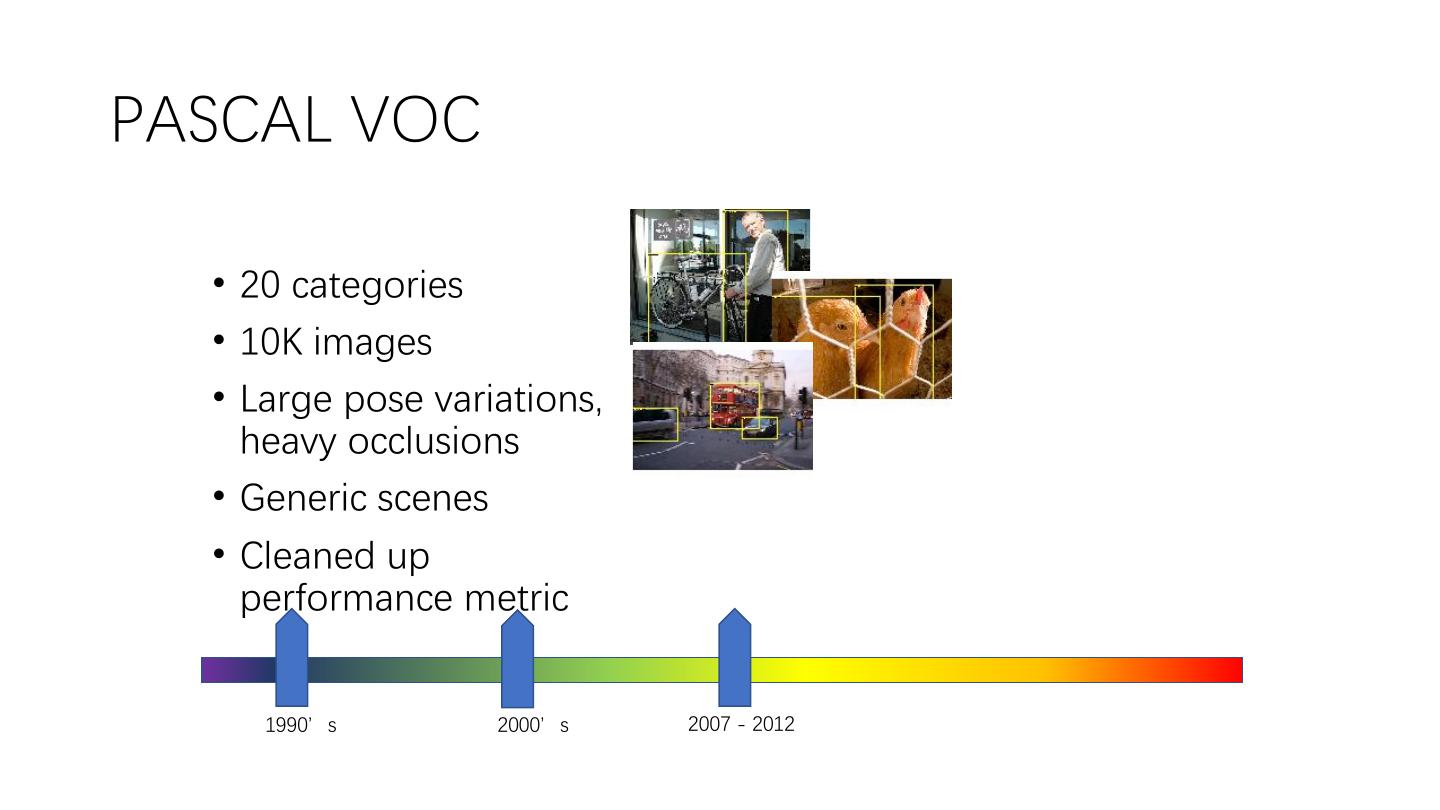 15 .PASCAL VOC • 20 categories • 10K images • Large pose variations, heavy occlusions • Generic scenes • Cleaned up performance metric 1990’s 2000’s 2007 - 2012