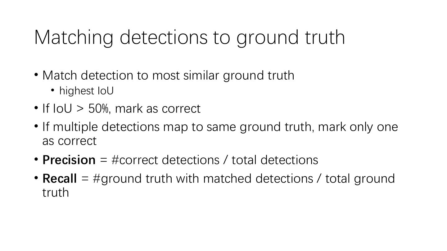19 .Matching detections to ground truth • Match detection to most similar ground truth • highest IoU • If IoU > 50%, mark as correct • If multiple detections map to same ground truth, mark only one as correct • Precision = #correct detections / total detections • Recall = #ground truth with matched detections / total ground truth