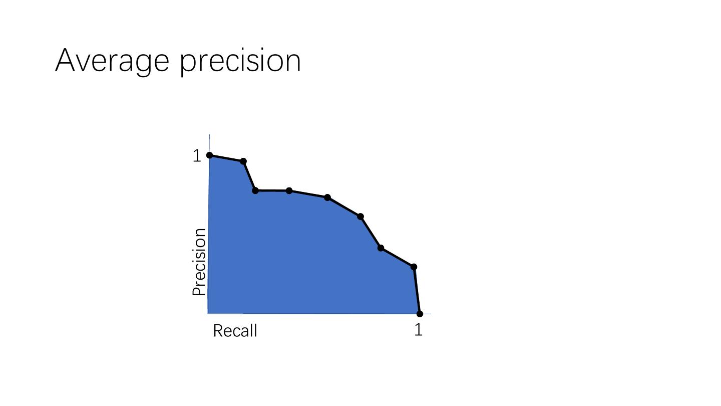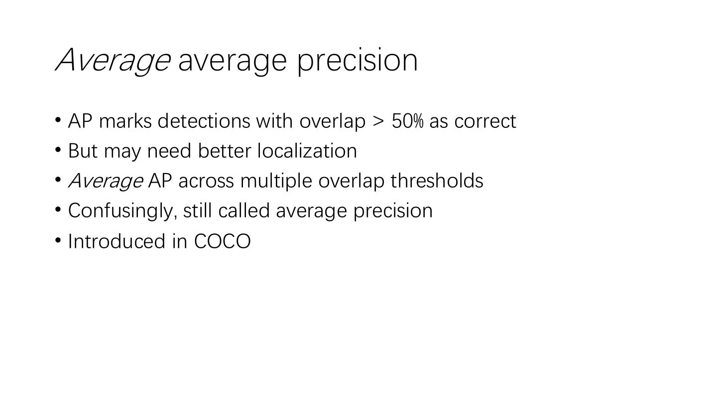 22 .Average average precision • AP marks detections with overlap > 50% as correct • But may need better localization • Average AP across multiple overlap thresholds • Confusingly, still called average precision • Introduced in COCO