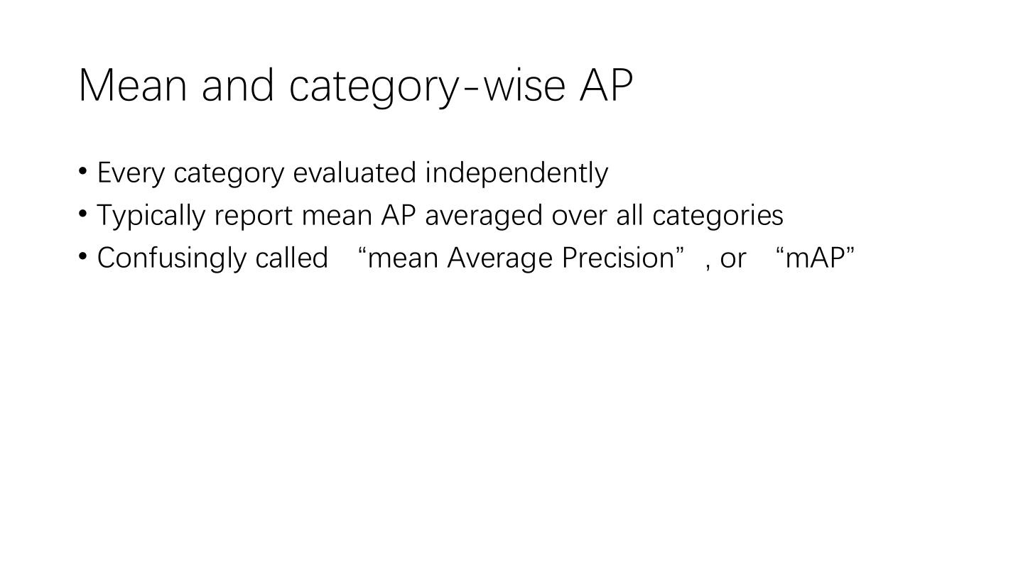 23 .Mean and category-wise AP • Every category evaluated independently • Typically report mean AP averaged over all categories • Confusingly called “mean Average Precision”, or “mAP”