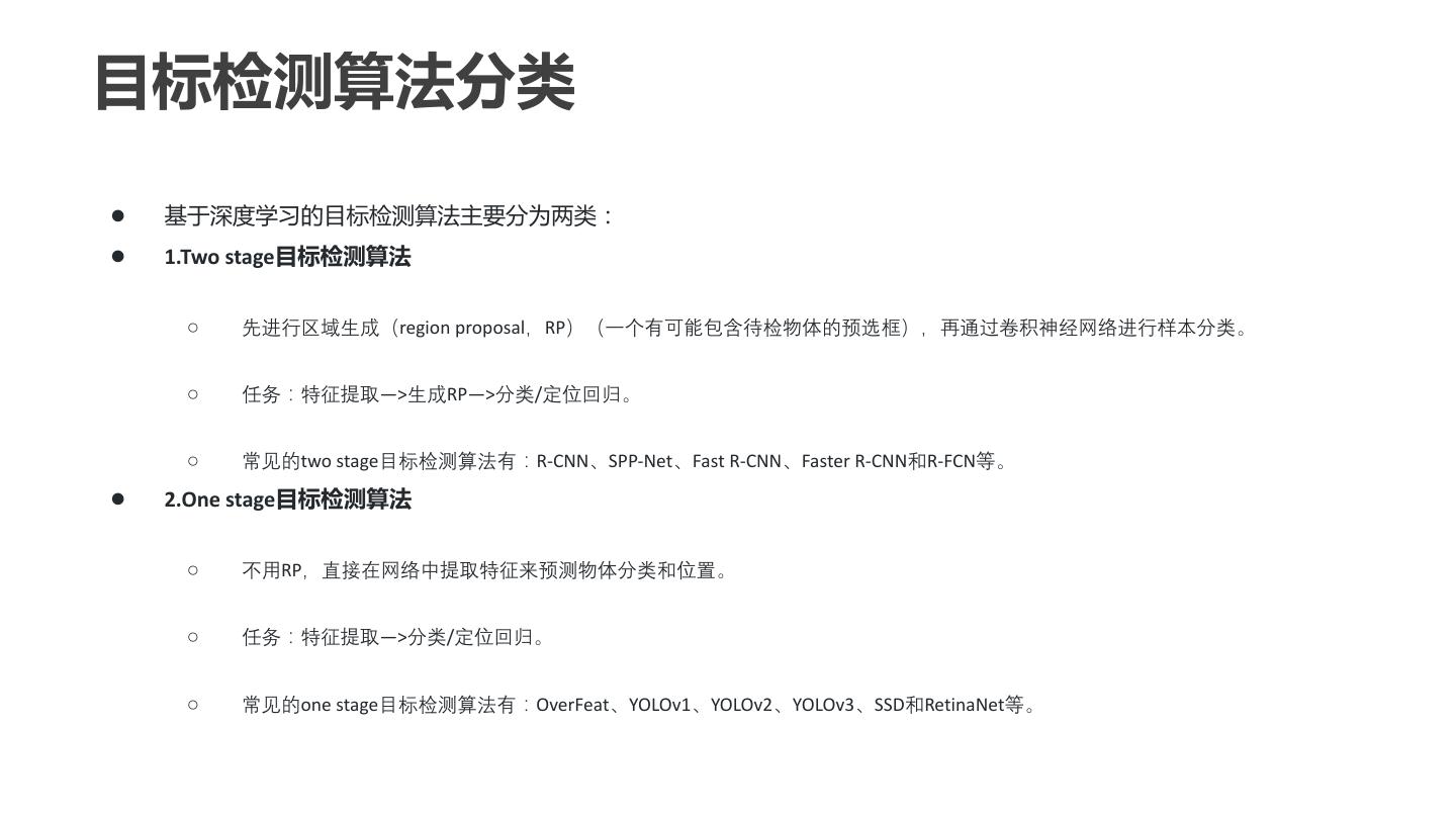 27 .目标检测算法分类 ● 基于深度学习的目标检测算法主要分为两类: ● 1.Two stage目标检测算法 ○ 先进行区域生成(region proposal,RP)(一个有可能包含待检物体的预选框),再通过卷积神经网络进行样本分类。 ○ 任务:特征提取—>生成RP—>分类/定位回归。 ○ 常见的two stage目标检测算法有:R-CNN、SPP-Net、Fast R-CNN、Faster R-CNN和R-FCN等。 ● 2.One stage目标检测算法 ○ 不用RP,直接在网络中提取特征来预测物体分类和位置。 ○ 任务:特征提取—>分类/定位回归。 ○ 常见的one stage目标检测算法有:OverFeat、YOLOv1、YOLOv2、YOLOv3、SSD和RetinaNet等。
