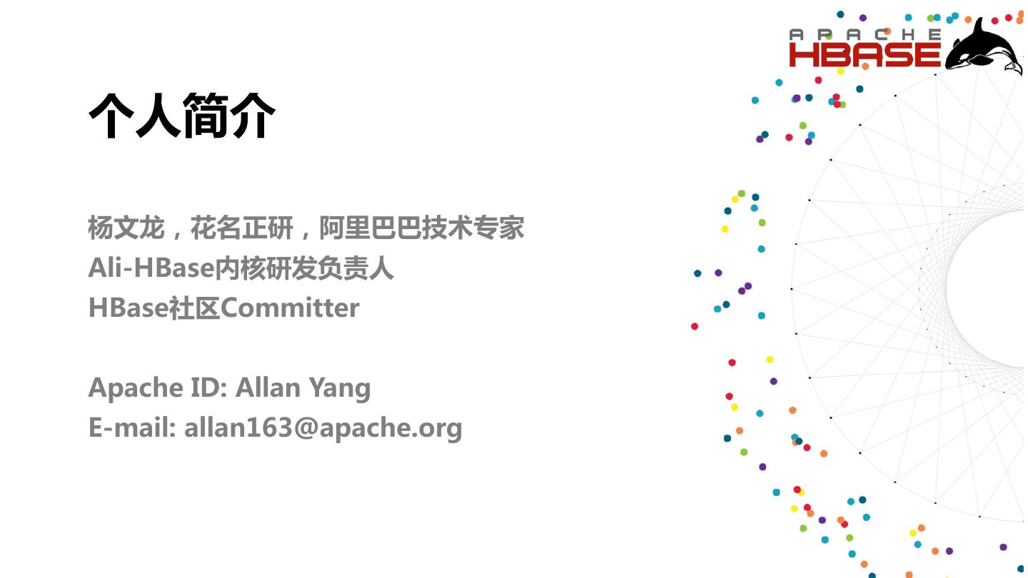 2 .个人简介 杨文龙,花名正研,阿里巴巴技术专家 Ali-HBase内核研发负责人 HBase社区Committer Apache ID: Allan Yang E-mail: allan163@apache.org