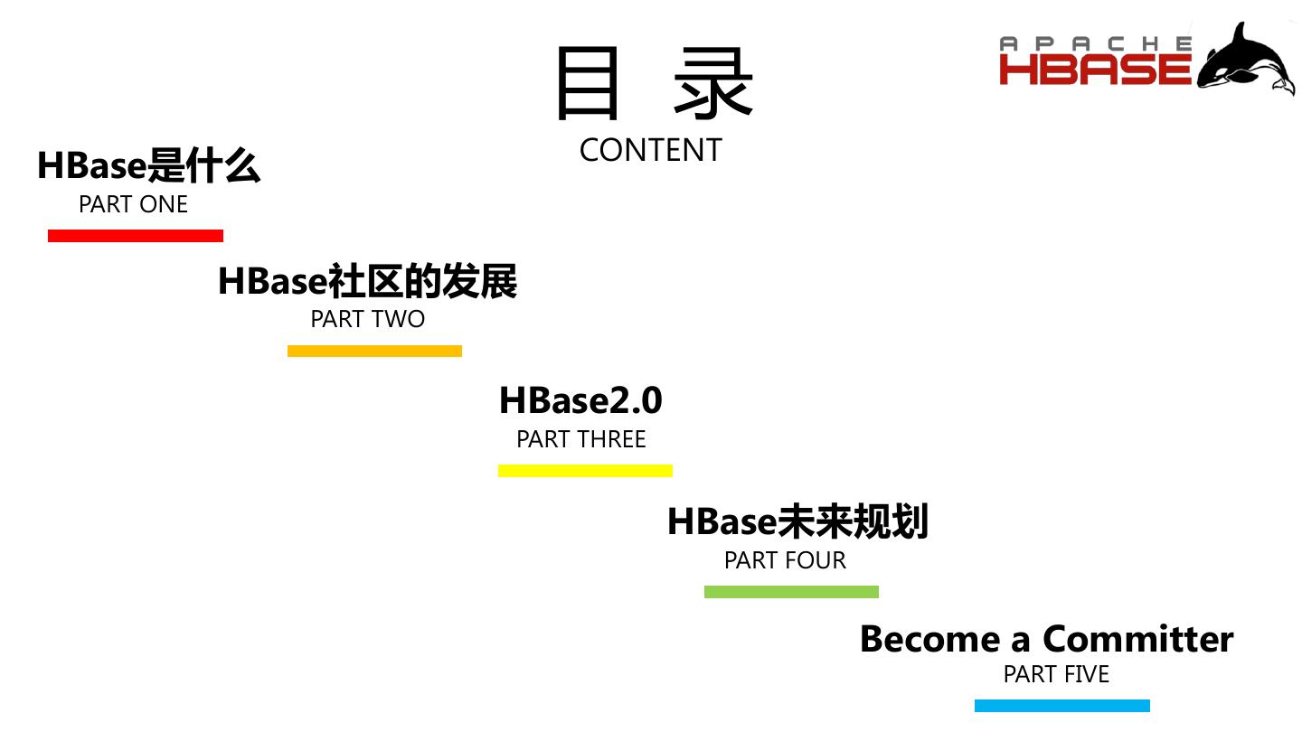 3 . 目 录 CONTENT HBase是什么 PART ONE HBase社区的发展 PART TWO HBase2.0 PART THREE HBase未来规划 PART FOUR Become a Committer PART FIVE