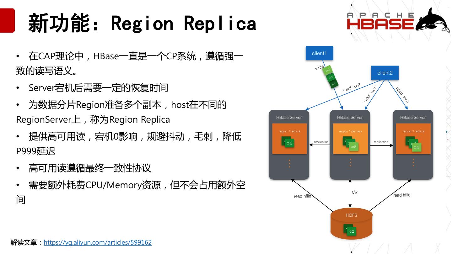 21 . 新功能:Region Replica • 在CAP理论中,HBase一直是一个CP系统,遵循强一 致的读写语义。 • Server宕机后需要一定的恢复时间 • 为数据分片Region准备多个副本,host在不同的 RegionServer上,称为Region Replica • 提供高可用读,宕机0影响,规避抖动,毛刺,降低 P999延迟 • 高可用读遵循最终一致性协议 • 需要额外耗费CPU/Memory资源,但不会占用额外空 间 解读文章:https://yq.aliyun.com/articles/599162