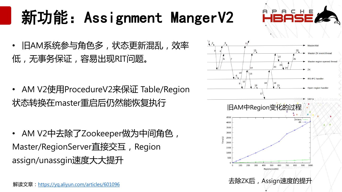 26 . 新功能:Assignment MangerV2 • 旧AM系统参与角色多,状态更新混乱,效率 低,无事务保证,容易出现RIT问题。 • AM V2使用ProcedureV2来保证 Table/Region 状态转换在master重启后仍然能恢复执行 旧AM中Region变化的过程 • AM V2中去除了Zookeeper做为中间角色, Master/RegionServer直接交互,Region assign/unassgin速度大大提升 解读文章:https://yq.aliyun.com/articles/601096 去除ZK后,Assign速度的提升