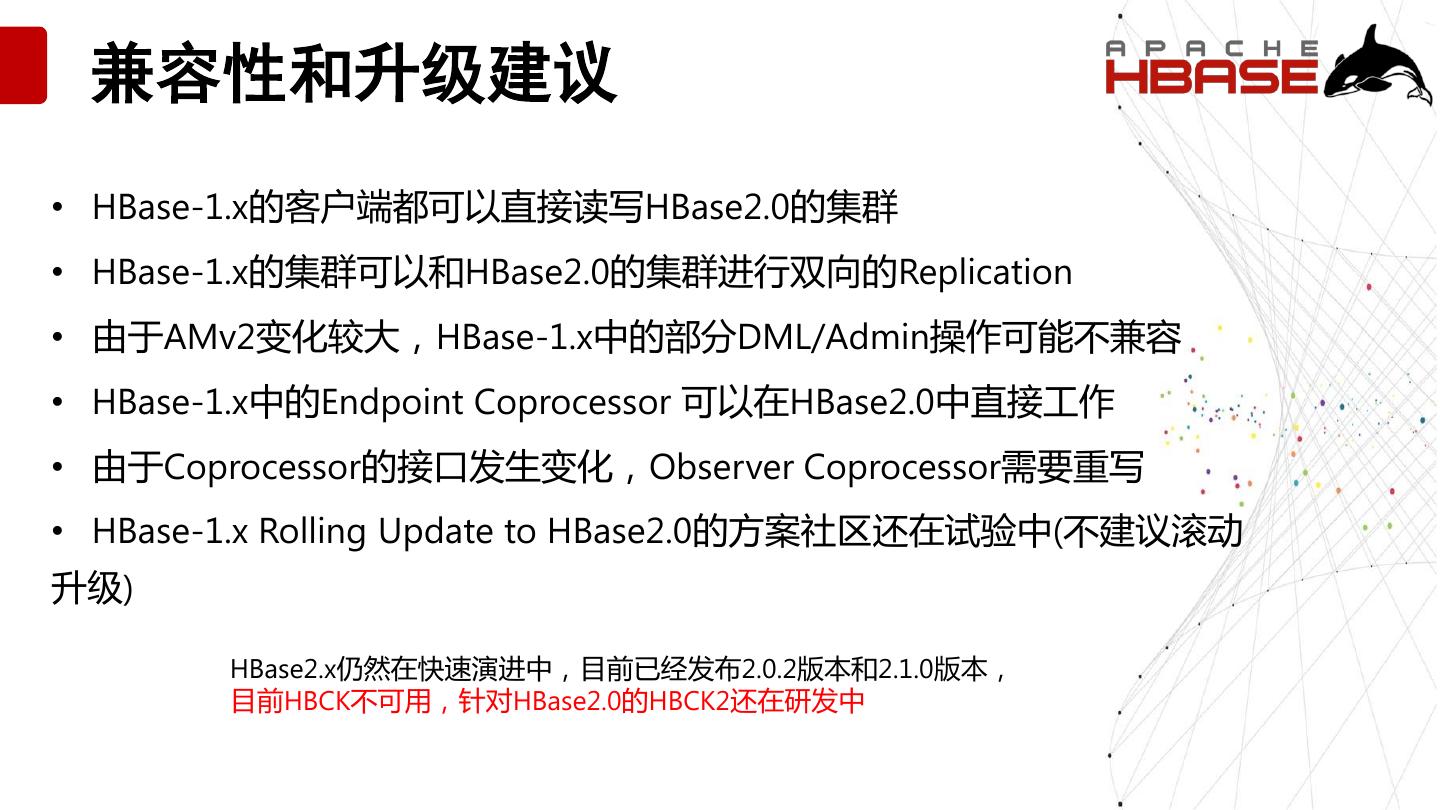 28 . 兼容性和升级建议 • HBase-1.x的客户端都可以直接读写HBase2.0的集群 • HBase-1.x的集群可以和HBase2.0的集群进行双向的Replication • 由于AMv2变化较大,HBase-1.x中的部分DML/Admin操作可能不兼容 • HBase-1.x中的Endpoint Coprocessor 可以在HBase2.0中直接工作 • 由于Coprocessor的接口发生变化,Observer Coprocessor需要重写 • HBase-1.x Rolling Update to HBase2.0的方案社区还在试验中(不建议滚动 升级) HBase2.x仍然在快速演进中,目前已经发布2.0.2版本和2.1.0版本, 目前HBCK不可用,针对HBase2.0的HBCK2还在研发中