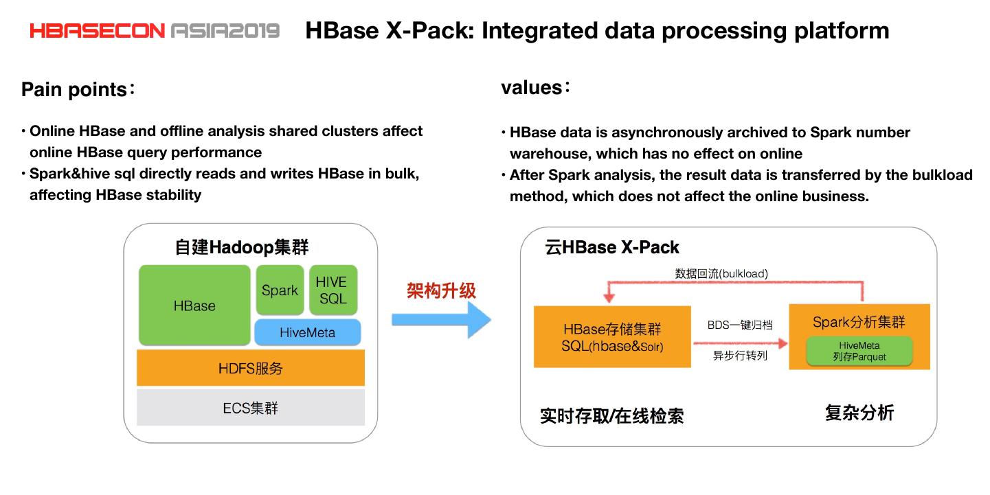 18 . HBase X-Pack: Big data risk control platform ( ) + + Spark Spark Streaming SQL MLlib Load ( HDFS) Kafka HBase Parquet (HDFS OSS) • Real-time news: Kafka accepts real-time collected messages, and can do simple things with smoke streaming • Archive by day increment: Data increments that are streamed to the storage service each day are archived to the spark offline warehouse • Offline data warehouse: used to store the full amount of data, the data is stored in HDFS on the column. • Full training model: spark supports complex computing, mlib, python is suitable for data computing training model • Model data Load: The new model Loaded to the model service for offline service to provide external control decision • Risk control simulation: When adding a heart rule or a new model at the training center, verify its good or bad, you can use the full amount of data to do training in the spark offline warehouse.