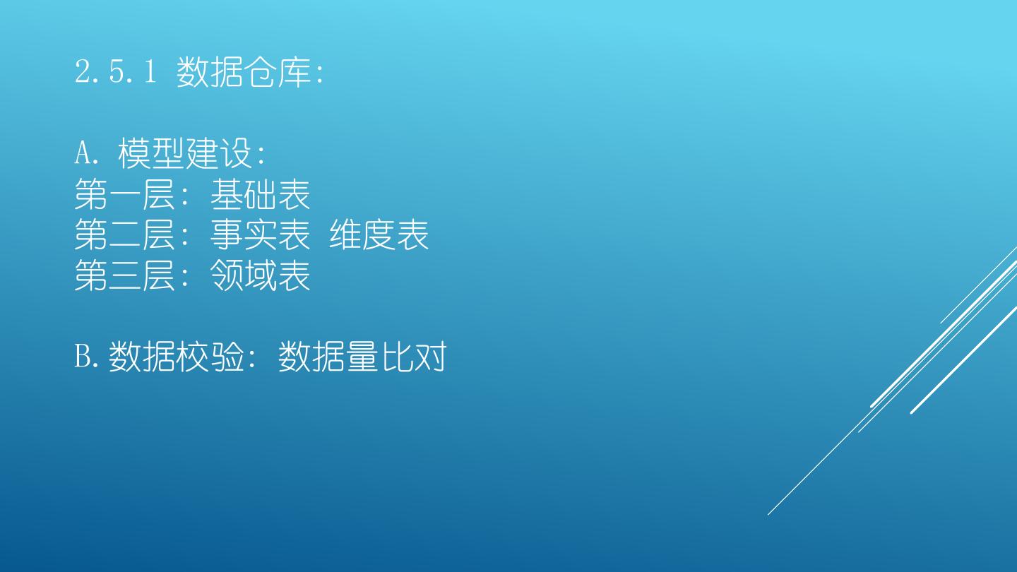 14 .2.5.1 数据仓库: A. 模型建设: 第一层: 基础表 第二层: 事实表 维度表 第三层: 领域表 B.数据校验: 数据量比对