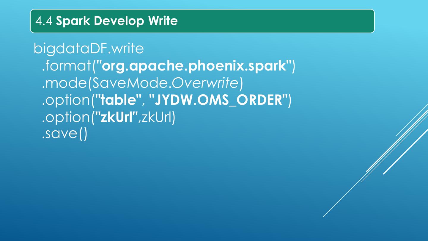 21 .4.4 Spark Develop Write bigdataDF.write .format("org.apache.phoenix.spark") .mode(SaveMode.Overwrite) .option("table", "JYDW.OMS_ORDER") .option("zkUrl",zkUrl) .save()