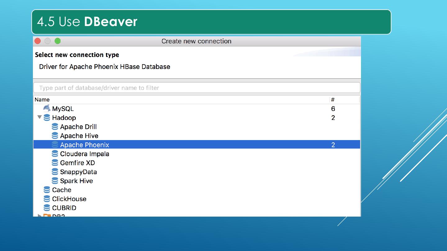 17 .4. 业务开发 1. Build Phoenix Table 2. Kafka+Spark Streaming+Phoenix 3. Spark Develop Read 4. Spark Develop Write 5. Use DBeaver