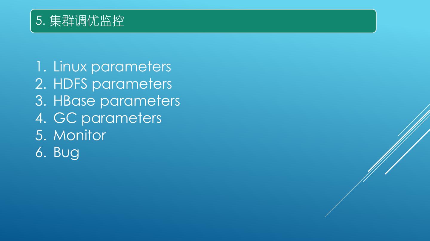 23 .5. 集群调优监控 1. Linux parameters 2. HDFS parameters 3. HBase parameters 4. GC parameters 5. Monitor 6. Bug