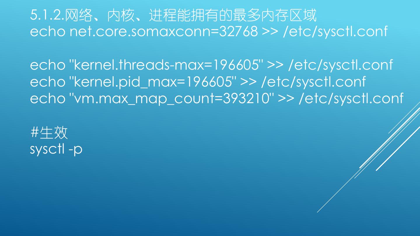 25 .5.1.2.网络、内核、进程能拥有的最多内存区域 echo net.core.somaxconn=32768 >> /etc/sysctl.conf echo "kernel.threads-max=196605" >> /etc/sysctl.conf echo "kernel.pid_max=196605" >> /etc/sysctl.conf echo "vm.max_map_count=393210" >> /etc/sysctl.conf #生效 sysctl -p