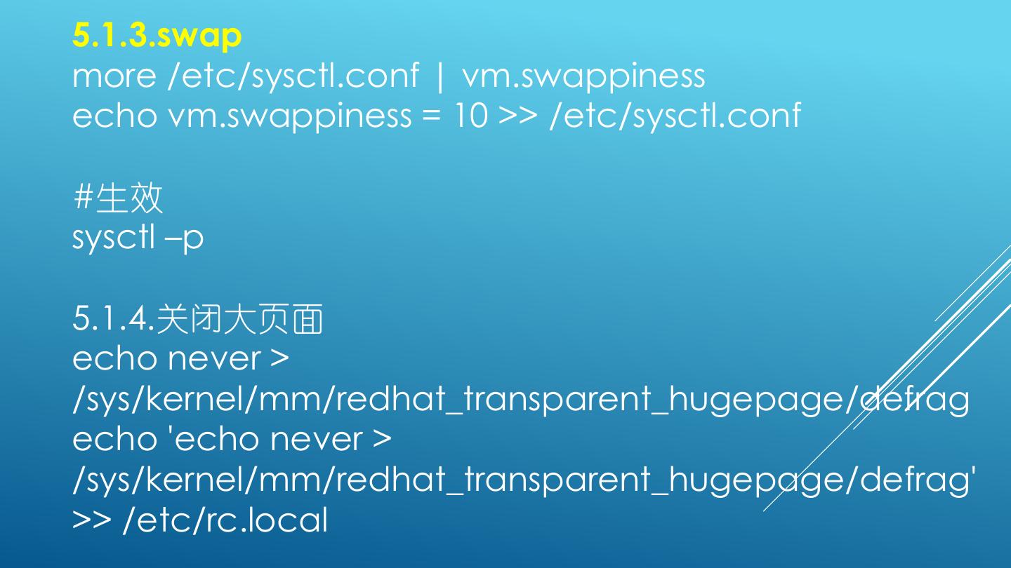26 .5.1.3.swap more /etc/sysctl.conf | vm.swappiness echo vm.swappiness = 10 >> /etc/sysctl.conf #生效 sysctl –p 5.1.4.关闭大页面 echo never > /sys/kernel/mm/redhat_transparent_hugepage/defrag echo 'echo never > /sys/kernel/mm/redhat_transparent_hugepage/defrag' >> /etc/rc.local
