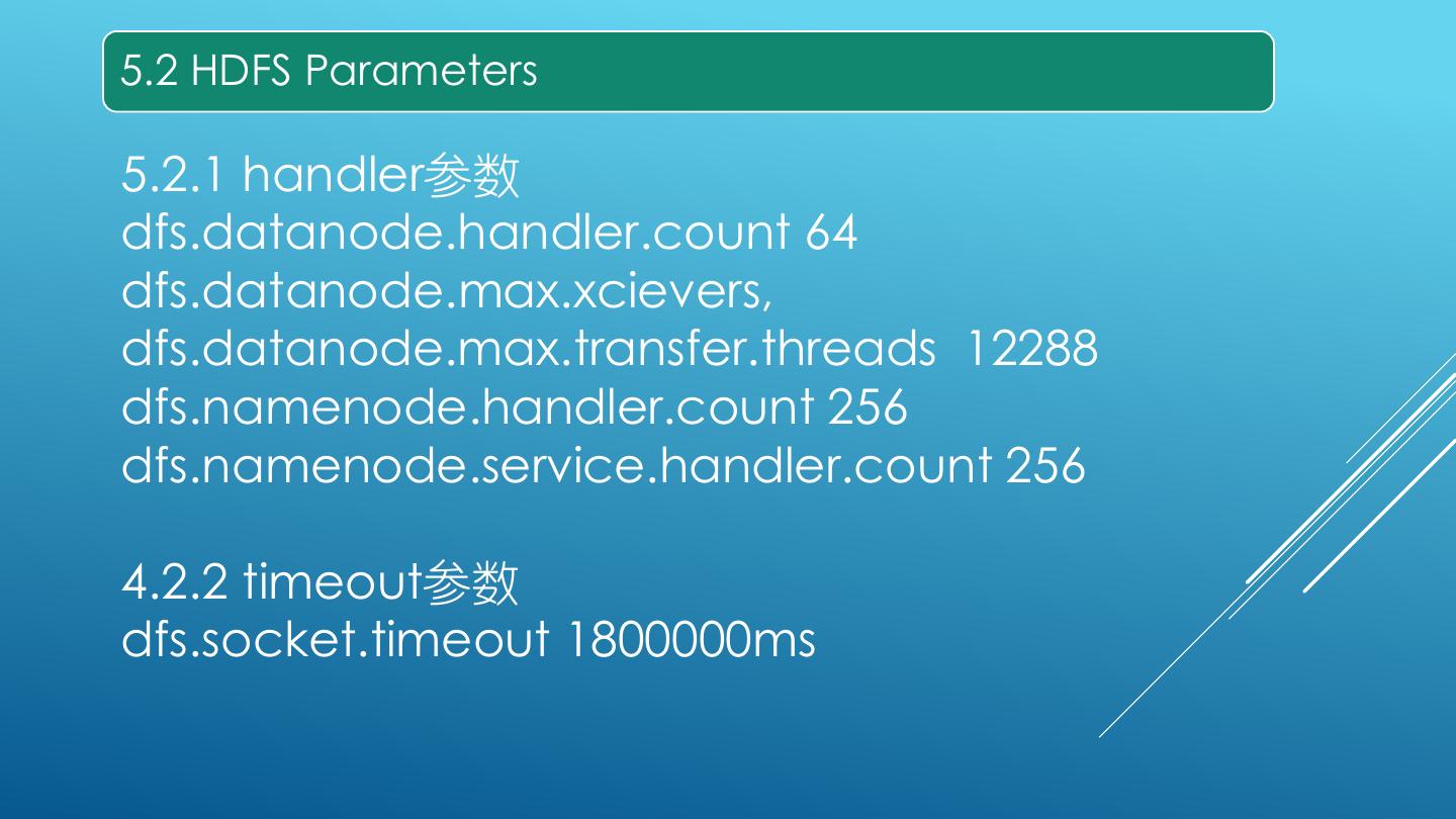 27 .5.2 HDFS Parameters 5.2.1 handler参数 dfs.datanode.handler.count 64 dfs.datanode.max.xcievers, dfs.datanode.max.transfer.threads 12288 dfs.namenode.handler.count 256 dfs.namenode.service.handler.count 256 4.2.2 timeout参数 dfs.socket.timeout 1800000ms