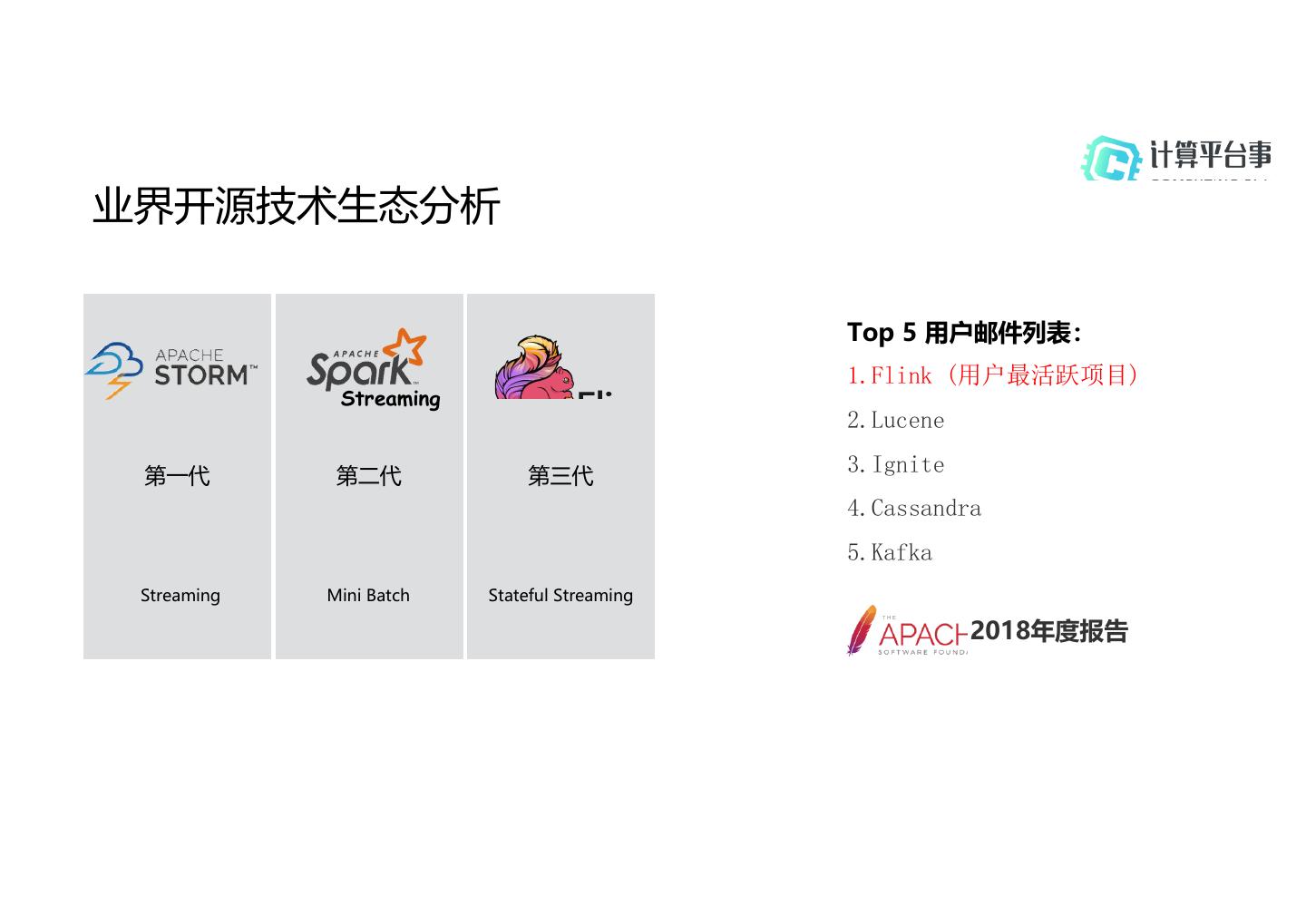 4 .业界开源技术生态分析 Top 5 用户邮件列表: 1.Flink (用户最活跃项目) Streaming 2.Lucene 第一代 第二代 第三代 3.Ignite 4.Cassandra 5.Kafka Streaming Mini Batch Stateful Streaming 2018年度报告