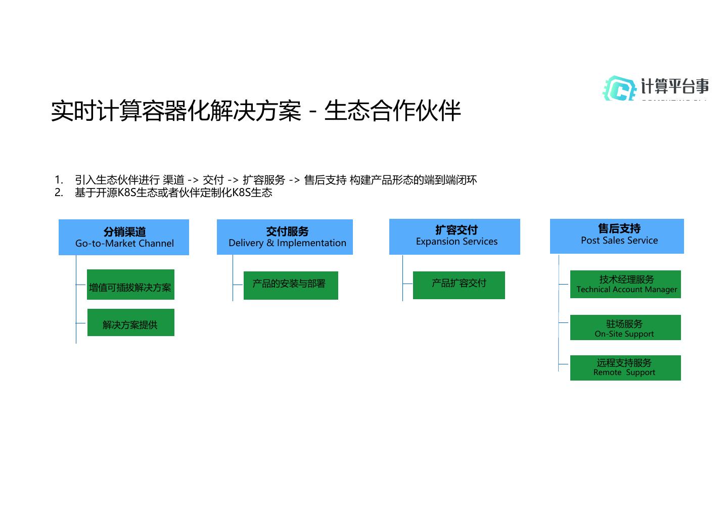 6 .实时计算容器化解决方案 - 生态合作伙伴 1. 引入生态伙伴进行 渠道 -> 交付 -> 扩容服务 -> 售后支持 构建产品形态的端到端闭环 2. 基于开源K8S生态或者伙伴定制化K8S生态 分销渠道 交付服务 扩容交付 售后支持 Go-to-Market Channel Delivery & Implementation Expansion Services Post Sales Service 产品的安装与部署 产品扩容交付 技术经理服务 增值可插拔解决方案 Technical Account Manager 解决方案提供 驻场服务 On-Site Support 远程支持服务 Remote Support