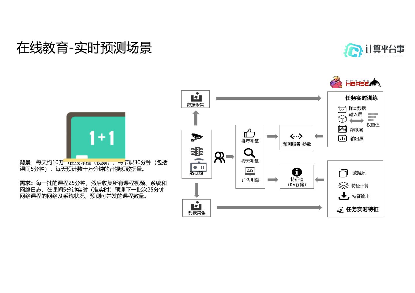 9 .在线教育-实时预测场景 任务实时训练 数据采集 样本数据 输入层 权重值 隐藏层 输出层 推荐引擎 预测服务-参数 背景:每天约10万节在线课程(视频),每节课30分钟(包括 搜索引擎 课间5分钟),每天预计数十万分钟的音视频数据量。 数据源 数据源 广告引擎 特征值 需求:每一批的课程25分钟,然后收集所有课程视频、系统和 (KV存储) 特征计算 网络日志,在课间5分钟实时(准实时)预测下一批次25分钟 网络课程的网络及系统状况,预测可并发的课程数量。 特征输出 任务实时特征 数据采集