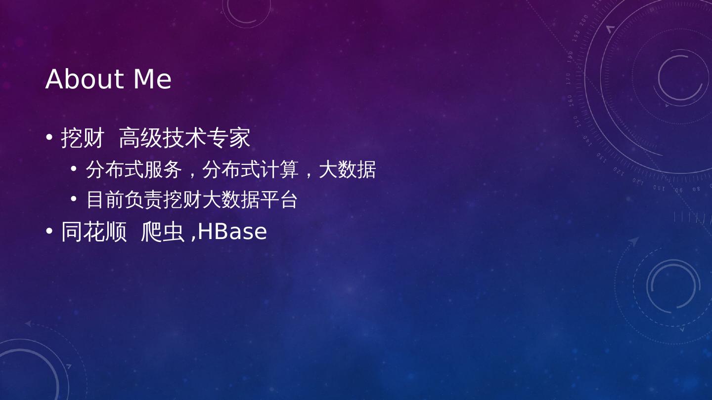 2 .About Me 挖财 高级技术专家 分布式服务,分布式计算,大数据 目前负责挖财大数据平台 同花顺 爬虫 ,HBase