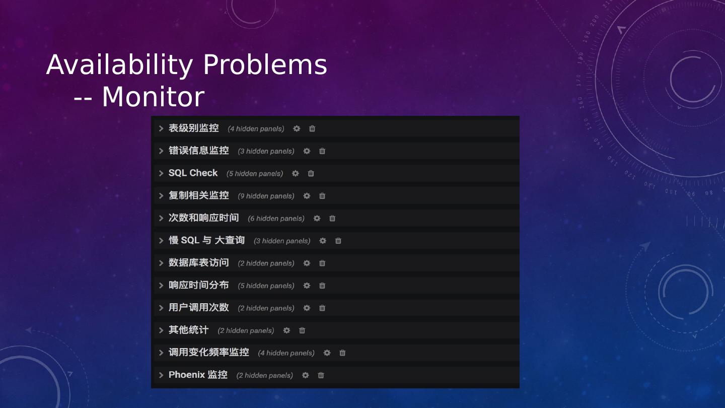 10 .Availability Problems 数据量 * 20 访问量 * 100 用户量膨胀 谁在干坏事 哪个表出现热点 什么 SQL 不合理