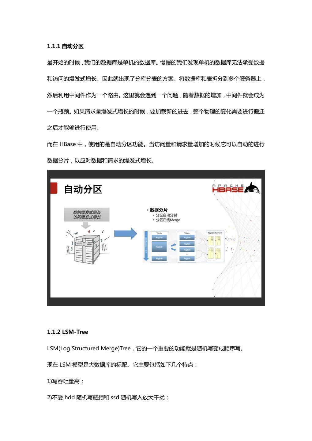 2 .1.1.1 自动分区 最开始的时候,我们的数据库是单机的数据库。慢慢的我们发现单机的数据库无法承受数据 和访问的爆发式增长。因此就出现了分库分表的方案。将数据库和表拆分到多个服务器上, 然后利用中间件作为一个路由。这里就会遇到一个问题,随着数据的增加,中间件就会成为 一个瓶颈。如果请求量爆发式增长的时候,要加载新的进去,整个物理的变化需要进行搬迁 之后才能够进行使用。 而在 HBase 中,使用的是自动分区功能。当访问量和请求量增加的时候它可以自动的进行 数据分片,以应对数据和请求的爆发式增长。 1.1.2 LSM-Tree LSM(Log Structured Merge)Tree,它的一个重要的功能就是随机写变成顺序写。 现在 LSM 模型是大数据库的标配。它主要包括如下几个特点: 1)写吞吐量高; 2)不受 hdd 随机写瓶颈和 ssd 随机写入放大干扰;
