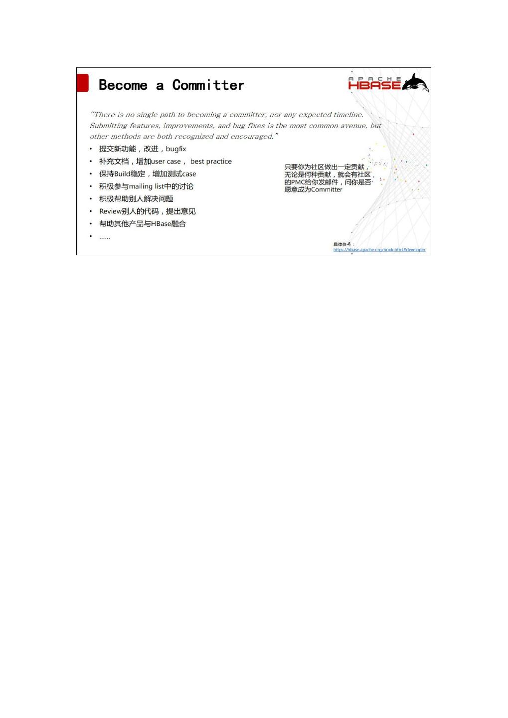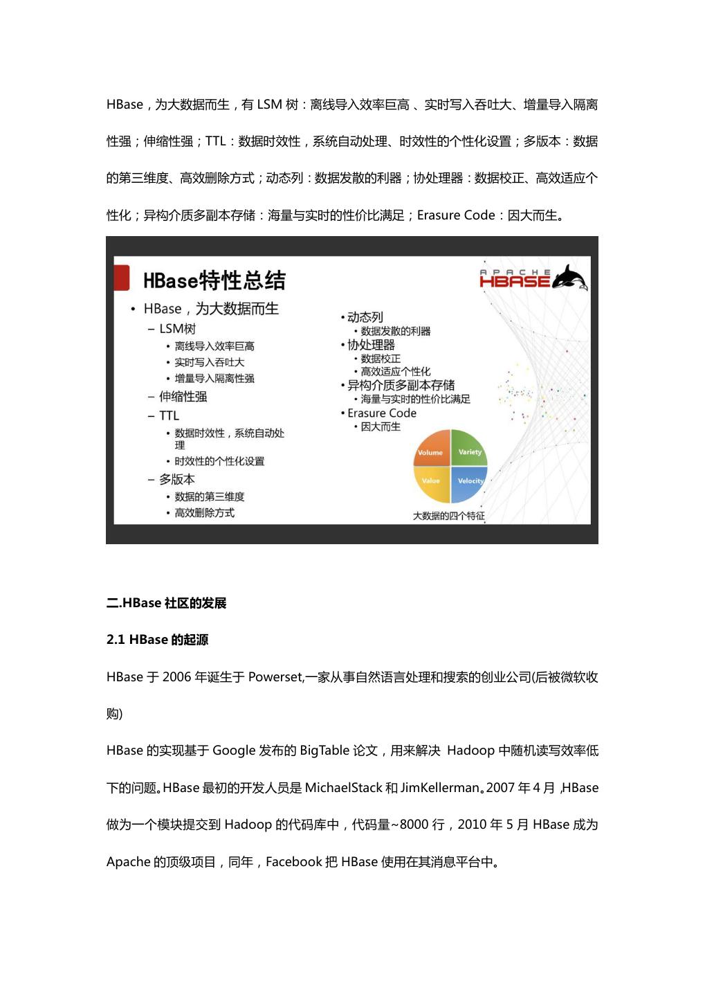 6 .HBase,为大数据而生,有 LSM 树:离线导入效率巨高 、实时写入吞吐大、增量导入隔离 性强;伸缩性强;TTL:数据时效性,系统自动处理、时效性的个性化设置;多版本:数据 的第三维度、高效删除方式;动态列:数据发散的利器;协处理器:数据校正、高效适应个 性化;异构介质多副本存储:海量与实时的性价比满足;Erasure Code:因大而生。 二.HBase 社区的发展 2.1 HBase 的起源 HBase 于 2006 年诞生于 Powerset,一家从事自然语言处理和搜索的创业公司(后被微软收 购) HBase 的实现基于 Google 发布的 BigTable 论文,用来解决 Hadoop 中随机读写效率低 下的问题。HBase 最初的开发人员是 MichaelStack 和 JimKellerman。2007 年 4 月,HBase 做为一个模块提交到 Hadoop 的代码库中,代码量~8000 行,2010 年 5 月 HBase 成为 Apache 的顶级项目,同年,Facebook 把 HBase 使用在其消息平台中。