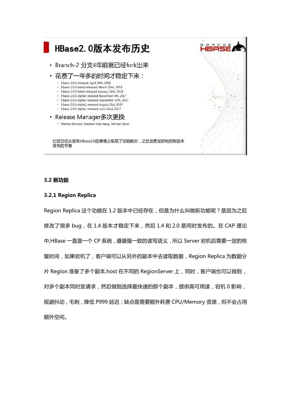 9 .3.2 新功能 3.2.1 Region Replica Region Replica 这个功能在 1.2 版本中已经存在,但是为什么叫做新功能呢?是因为之后 修改了很多 bug,在 1.4 版本才稳定下来,然后 1.4 和 2.0 是同时发布的。在 CAP 理论 中,HBase 一直是一个 CP 系统,遵循强一致的读写语义,所以 Server 宕机后需要一定的恢 复时间,如果宕机了,客户端可以从另外的副本中去读取数据,Region Replica 为数据分 片 Region 准备了多个副本,host 在不同的 RegionServer 上,同时,客户端也可以做到, 对多个副本同时发请求,然后做到选择最快速的那个副本,提供高可用读,宕机 0 影响, 规避抖动,毛刺,降低 P999 延迟;缺点是需要额外耗费 CPU/Memory 资源,但不会占用 额外空间。