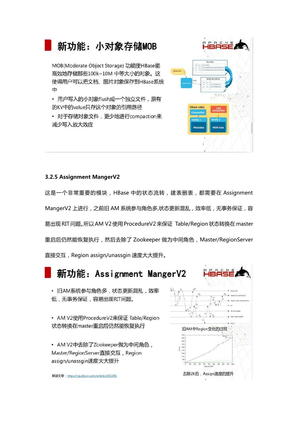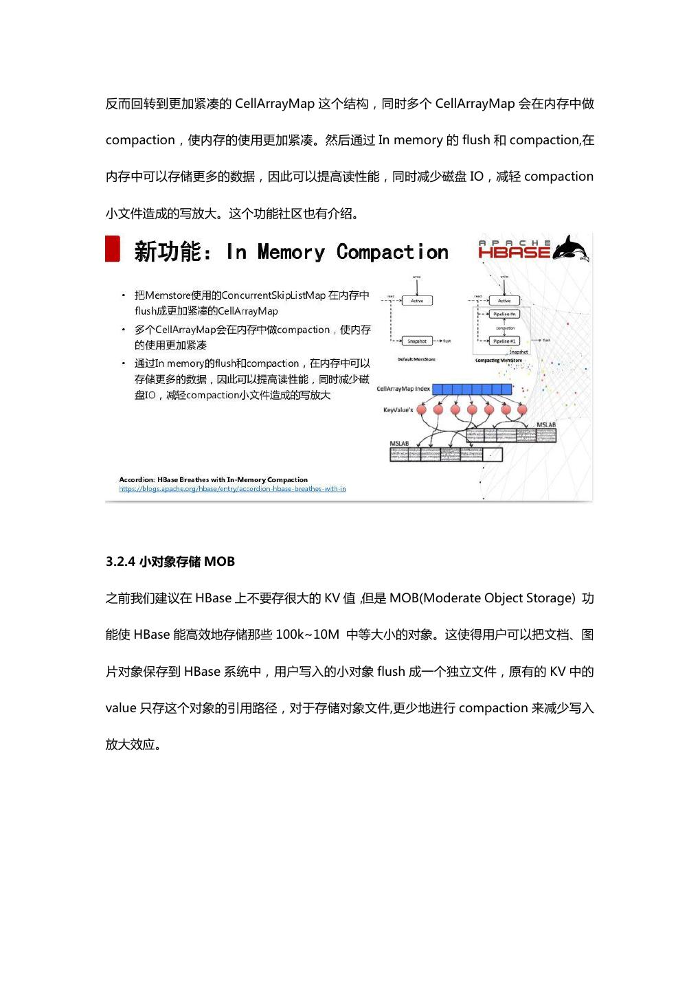 12 .反而回转到更加紧凑的 CellArrayMap 这个结构,同时多个 CellArrayMap 会在内存中做 compaction,使内存的使用更加紧凑。然后通过 In memory 的 flush 和 compaction,在 内存中可以存储更多的数据,因此可以提高读性能,同时减少磁盘 IO,减轻 compaction 小文件造成的写放大。这个功能社区也有介绍。 3.2.4 小对象存储 MOB 之前我们建议在 HBase 上不要存很大的 KV 值,但是 MOB(Moderate Object Storage) 功 能使 HBase 能高效地存储那些 100k~10M 中等大小的对象。这使得用户可以把文档、图 片对象保存到 HBase 系统中,用户写入的小对象 flush 成一个独立文件,原有的 KV 中的 value 只存这个对象的引用路径,对于存储对象文件,更少地进行 compaction 来减少写入 放大效应。