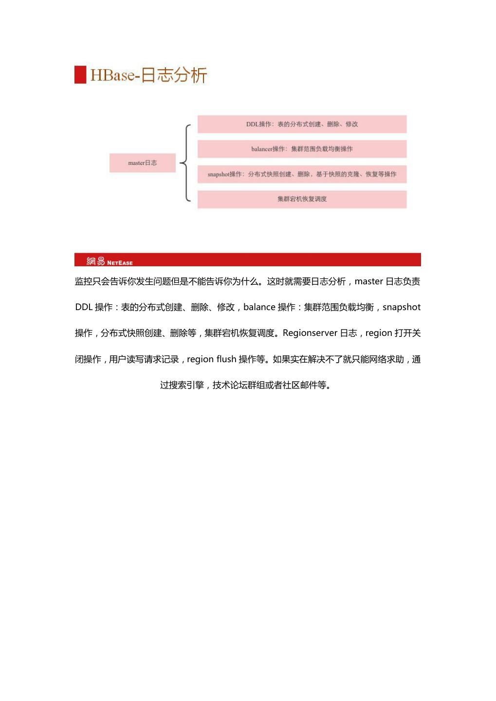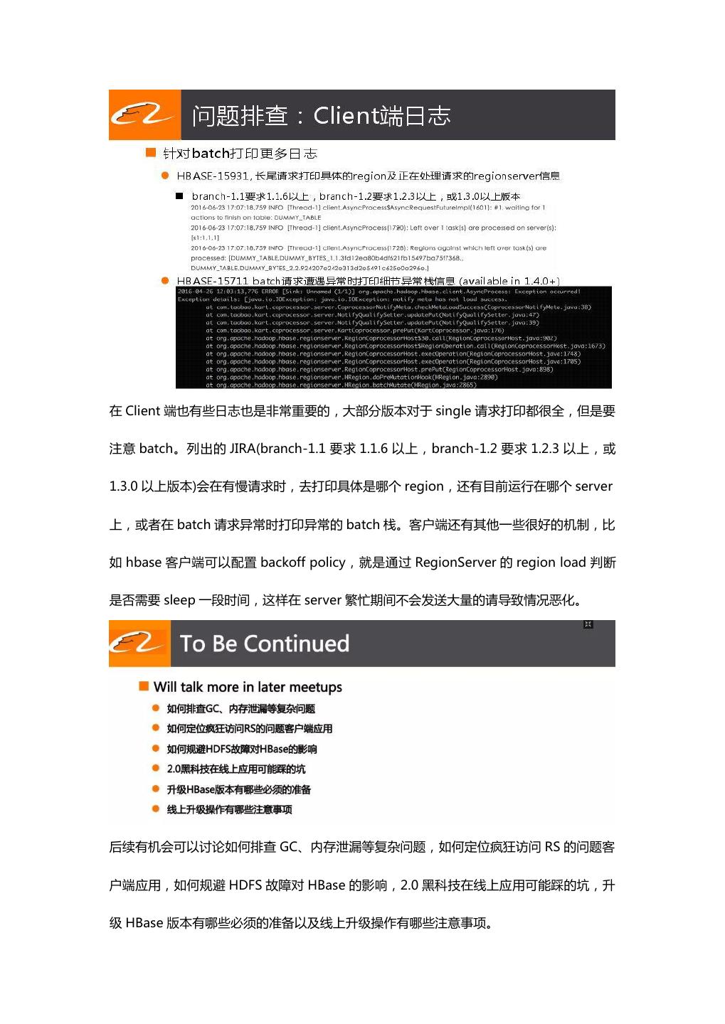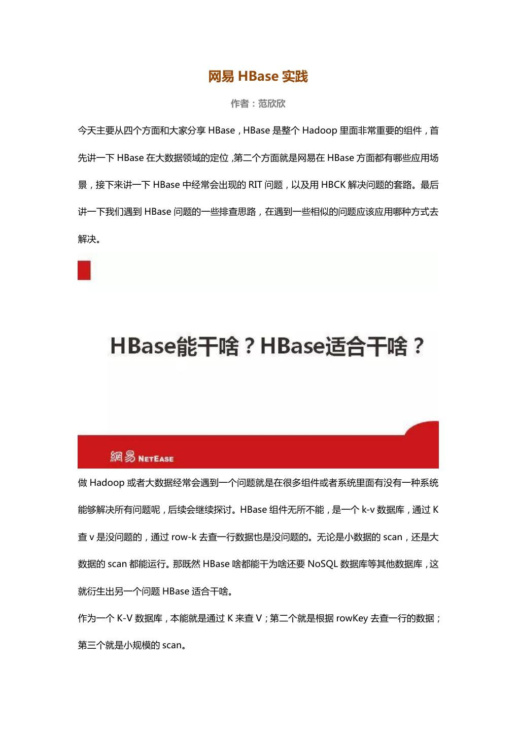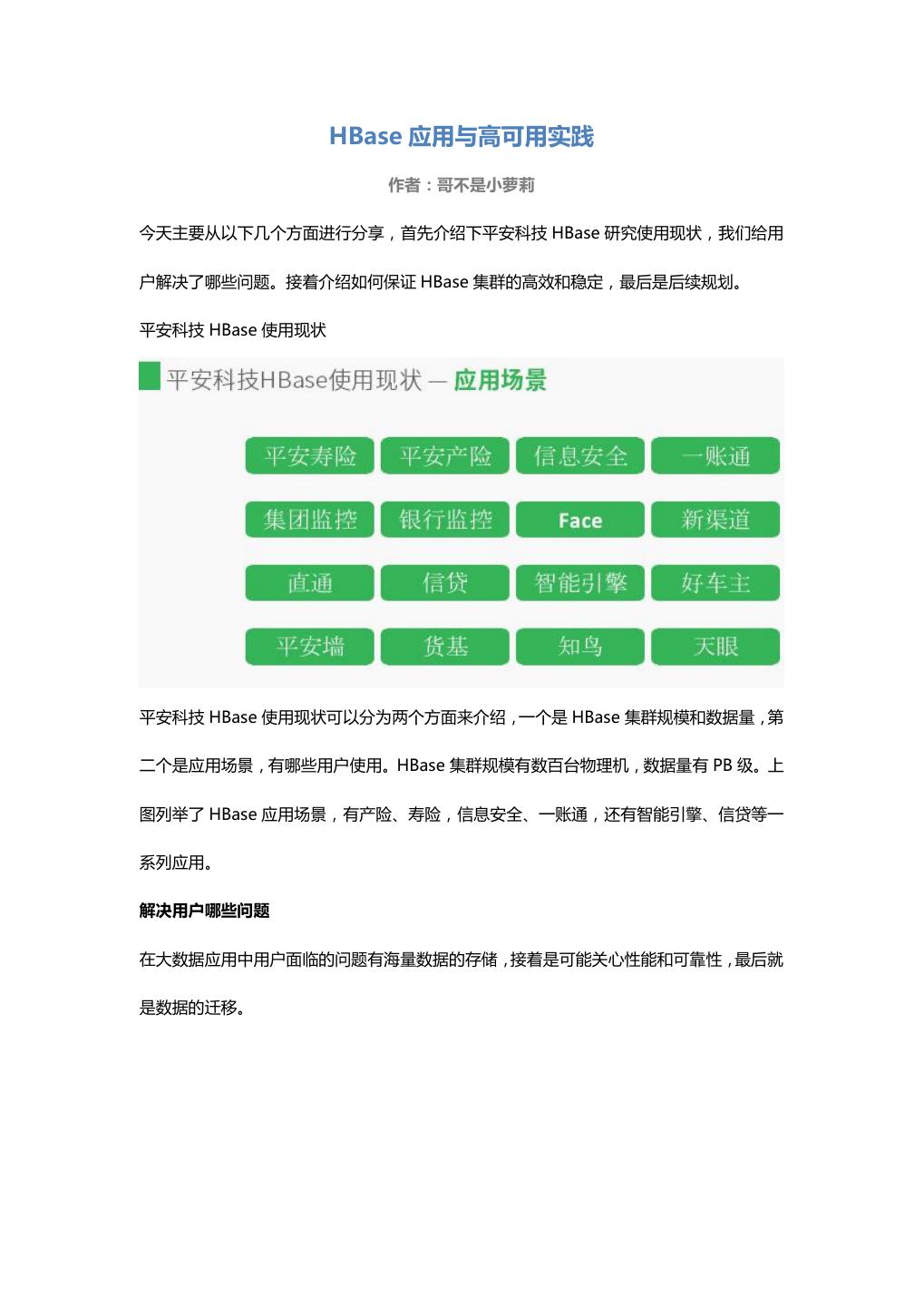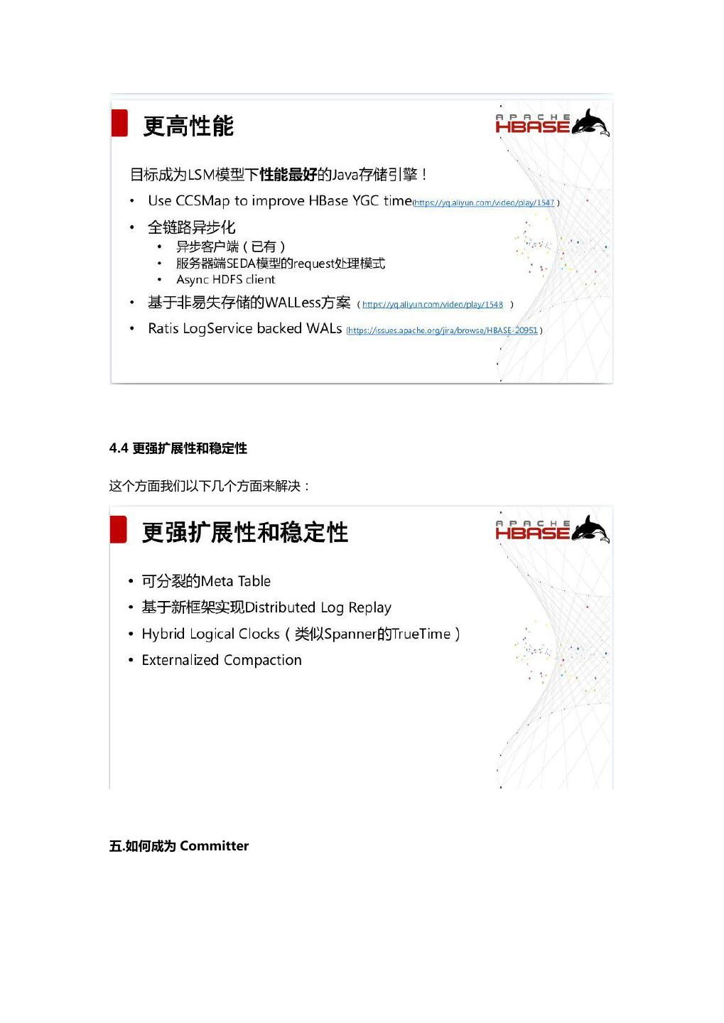 1 . Apache HBase 的现状和发展 作者:杨文龙 一.HBase 是什么 HBase(Hadoop Database),是一个基于 Google BigTable 论文设计的高可靠性、高性能、 可伸缩的分布式存储系统。 它有以下特征: 1.HBase 仍然是采用行存储的,采用松散表的结构来获得动态列的功能; 2.原生海量数据分布式存储。在单个数据库中可以存档 GB 甚至上 pb。在一行中也可以存 储上百万列。任何大小的数据量都适合采用 HBase; 3.不仅支持随机查询,还支持范围查询; 4.高吞吐,低延迟。一个集群可以有上千万个 dps,平均的延迟可以做到一毫秒之内; 5.在线 NOSQL 数据库; 6.多版本,增量导入,多维删除。 1.1 HBase 的四大基因