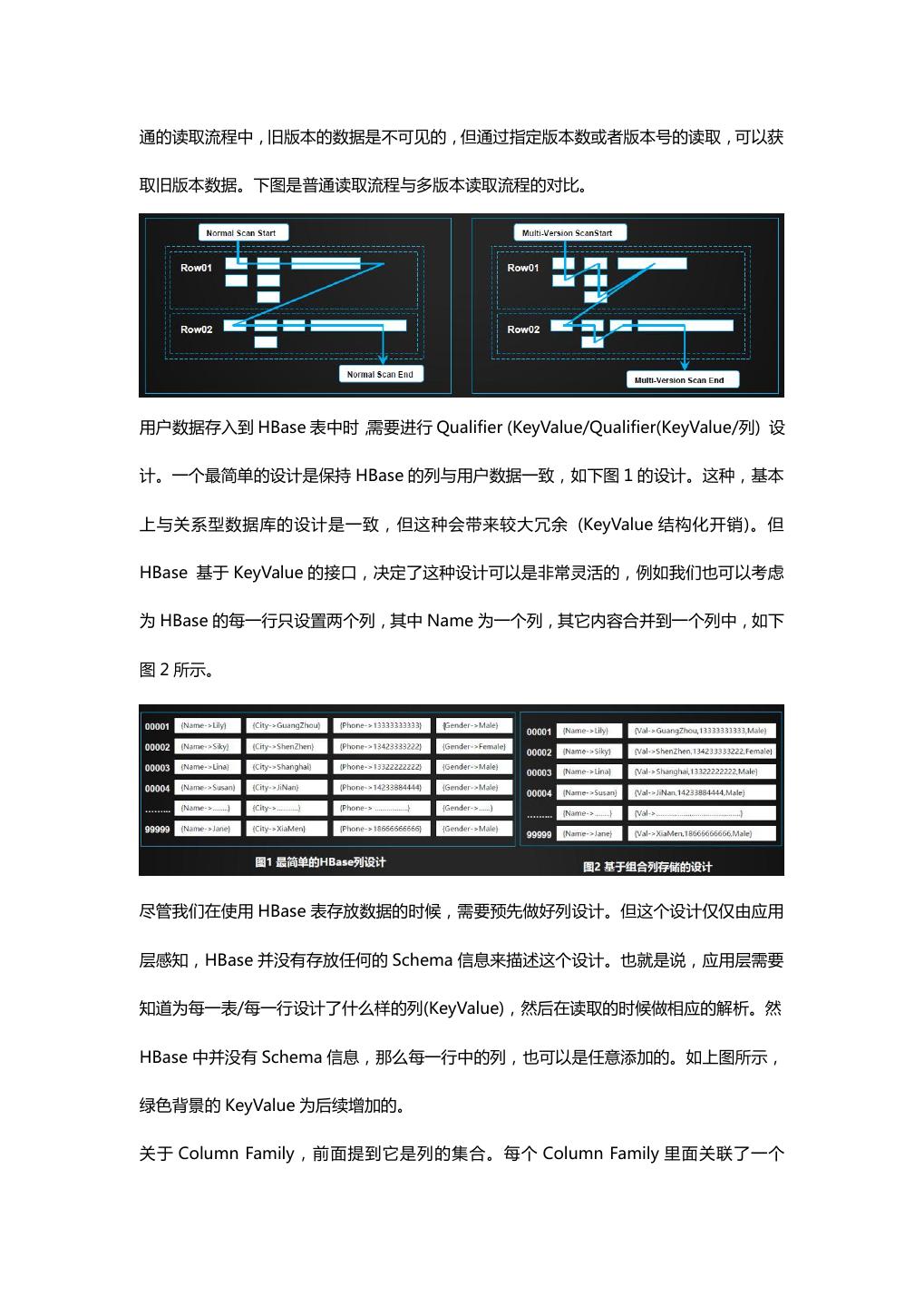 22 .通的读取流程中,旧版本的数据是不可见的,但通过指定版本数或者版本号的读取,可以获 取旧版本数据。下图是普通读取流程与多版本读取流程的对比。 用户数据存入到 HBase 表中时,需要进行 Qualifier (KeyValue/Qualifier(KeyValue/列) 设 计。一个最简单的设计是保持 HBase 的列与用户数据一致,如下图 1 的设计。这种,基本 上与关系型数据库的设计是一致,但这种会带来较大冗余 (KeyValue 结构化开销)。但 HBase 基于 KeyValue 的接口,决定了这种设计可以是非常灵活的,例如我们也可以考虑 为 HBase 的每一行只设置两个列,其中 Name 为一个列,其它内容合并到一个列中,如下 图 2 所示。 尽管我们在使用 HBase 表存放数据的时候,需要预先做好列设计。但这个设计仅仅由应用 层感知,HBase 并没有存放任何的 Schema 信息来描述这个设计。也就是说,应用层需要 知道为每一表/每一行设计了什么样的列(KeyValue),然后在读取的时候做相应的解析。然 HBase 中并没有 Schema 信息,那么每一行中的列,也可以是任意添加的。如上图所示, 绿色背景的 KeyValue 为后续增加的。 关于 Column Family,前面提到它是列的集合。每个 Column Family 里面关联了一个