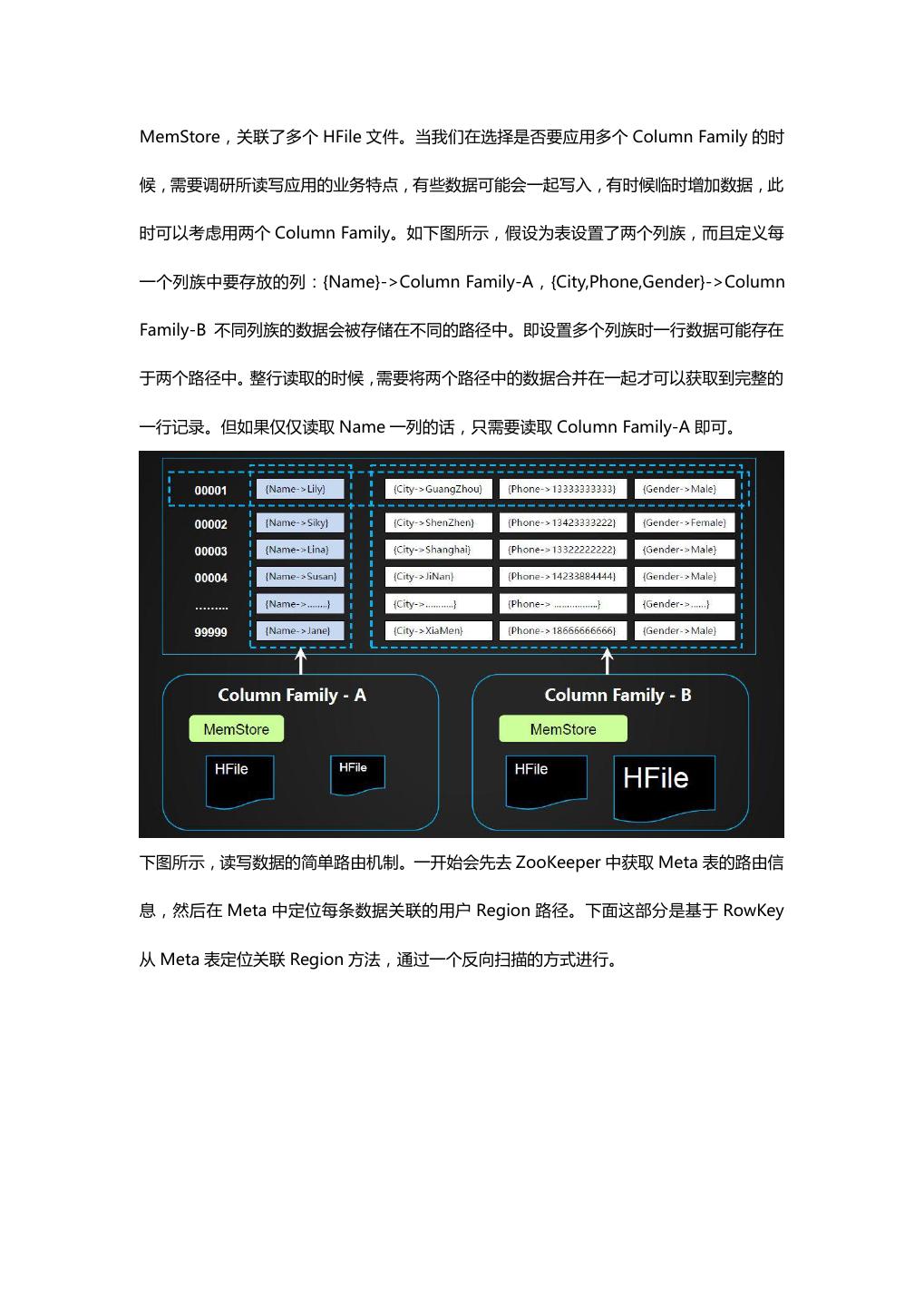 23 .MemStore,关联了多个 HFile 文件。当我们在选择是否要应用多个 Column Family 的时 候,需要调研所读写应用的业务特点,有些数据可能会一起写入,有时候临时增加数据,此 时可以考虑用两个 Column Family。如下图所示,假设为表设置了两个列族,而且定义每 一个列族中要存放的列:{Name}->Column Family-A,{City,Phone,Gender}->Column Family-B 不同列族的数据会被存储在不同的路径中。即设置多个列族时一行数据可能存在 于两个路径中。整行读取的时候,需要将两个路径中的数据合并在一起才可以获取到完整的 一行记录。但如果仅仅读取 Name 一列的话,只需要读取 Column Family-A 即可。 下图所示,读写数据的简单路由机制。一开始会先去 ZooKeeper 中获取 Meta 表的路由信 息,然后在 Meta 中定位每条数据关联的用户 Region 路径。下面这部分是基于 RowKey 从 Meta 表定位关联 Region 方法,通过一个反向扫描的方式进行。