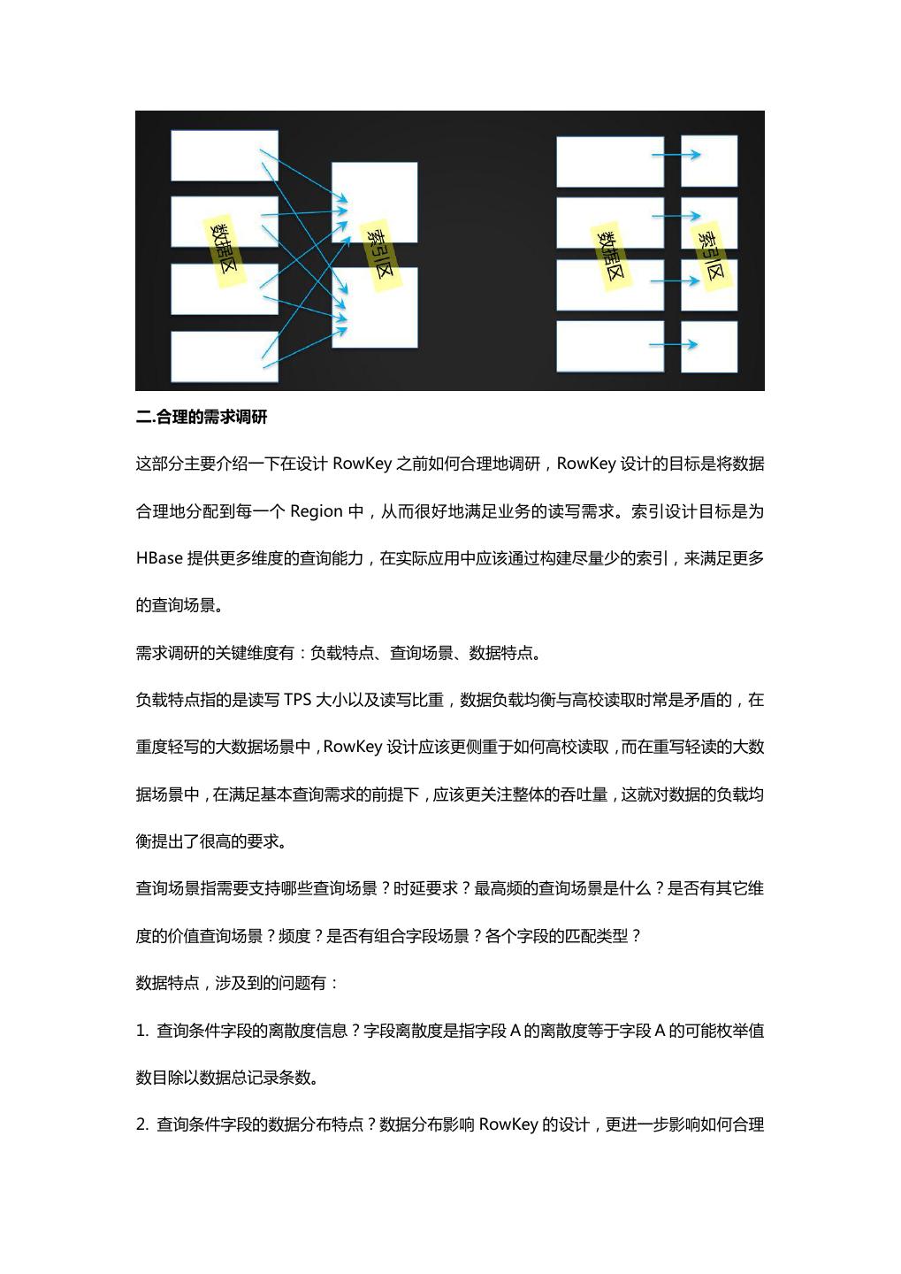 19 . HBase RowKey 与索引设计 作者:毕杰山 今天分享的内容主要是 HBase RowKey 与索引设计相关的一些技巧、原则和相关案例。将 分以下四部分分析,第一部分简单介绍 HBase 基础知识,第二部分探讨合理的需求调研方 法 , 第 三 部 分 是 关 于 RowKey 与 索 引 设 计 的 一 些 技 巧 、 原 则 , 第 四 部 分 是 关 于 OpenTSDB/JanusGraph/GeoMesa 典型案例的设计分享。 一.HBase 基础 第一部分包括基础概念与数据模型介绍、快速浏览读写流程、介绍 RowKey 在读写流程中 发挥的作用。 首先是基本概念介绍。 Table:同传统数据库中的表是类似的,但他的不同之处在于它是基于 SchemaLess 的设计, 比传统数据库表更加灵活。 Region:将表横向切割成一个个子表,从而实现分布式的存储,子表在 HBase 中称作