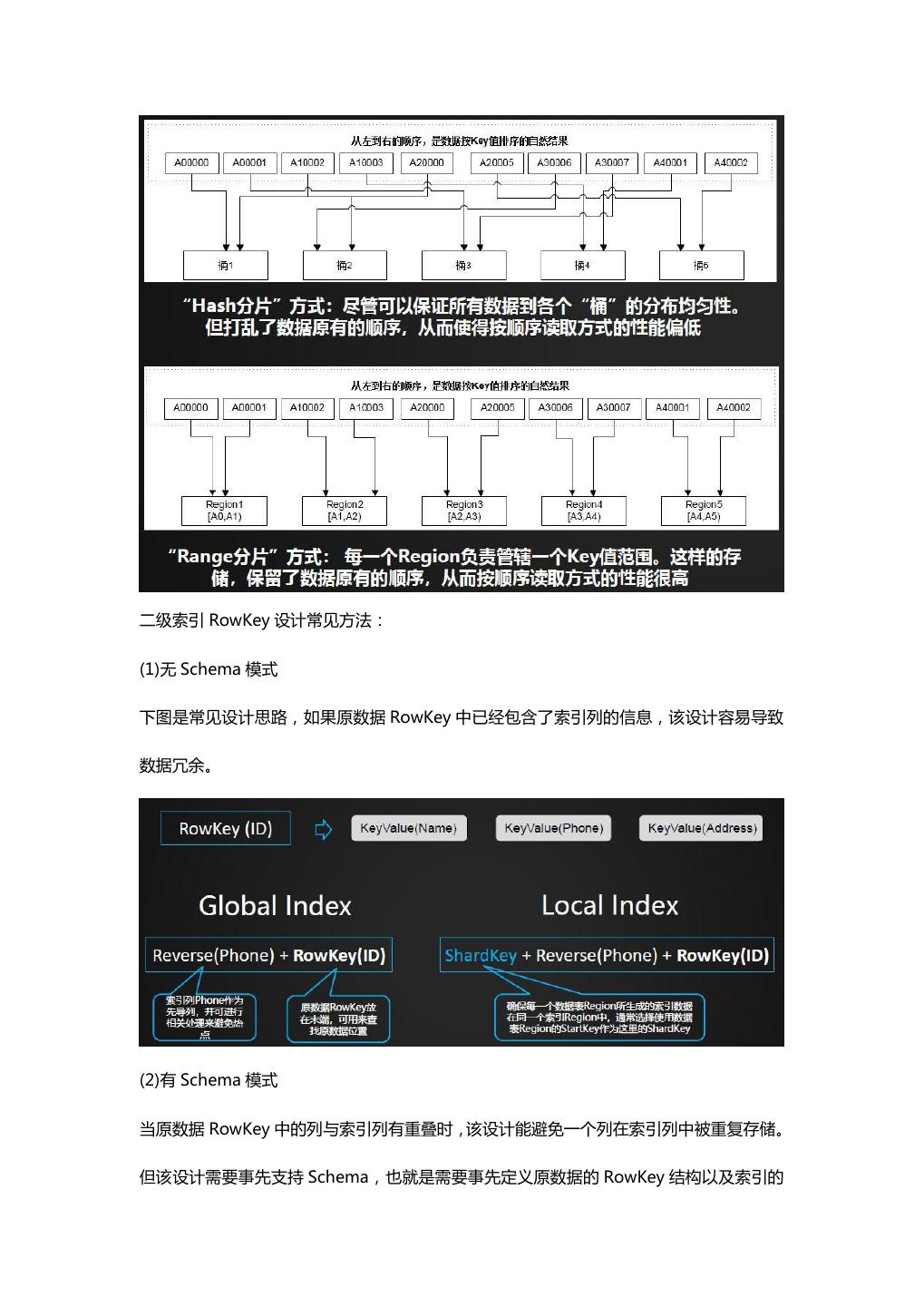 29 .常见的两种二级索引。方案一全局索引(下右图)、方案二本地索引(下左图)。方案一优点: 数据按索引字段全部排序,基于索引字段的小批次查询性能高。能够支持更大的查询并发数。 方法的复杂度较低。缺点是:生成索引数据对实时写入的影响较大。方案二优点:每一个用 户 Region 都拥有独立的索引数据,目前最佳的实践是将这部分索引数据存放于一个独立的 列族中。方案缺点:按索引字段进行查询时,需要访问所有的索引 Region,随着数据量和 Region 数目的不断增多,查询时延无保障,查询所支持的并发数也会降低。