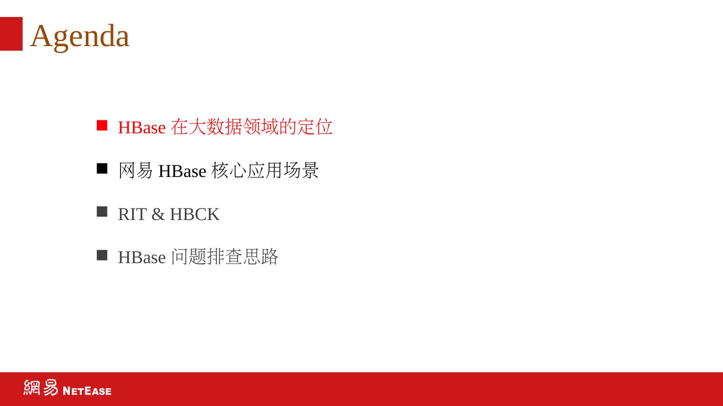2 .Agenda HBase 在大数据领域的定位 网易 HBase 核心应用场景 RIT & HBCK HBase 问题排查思路