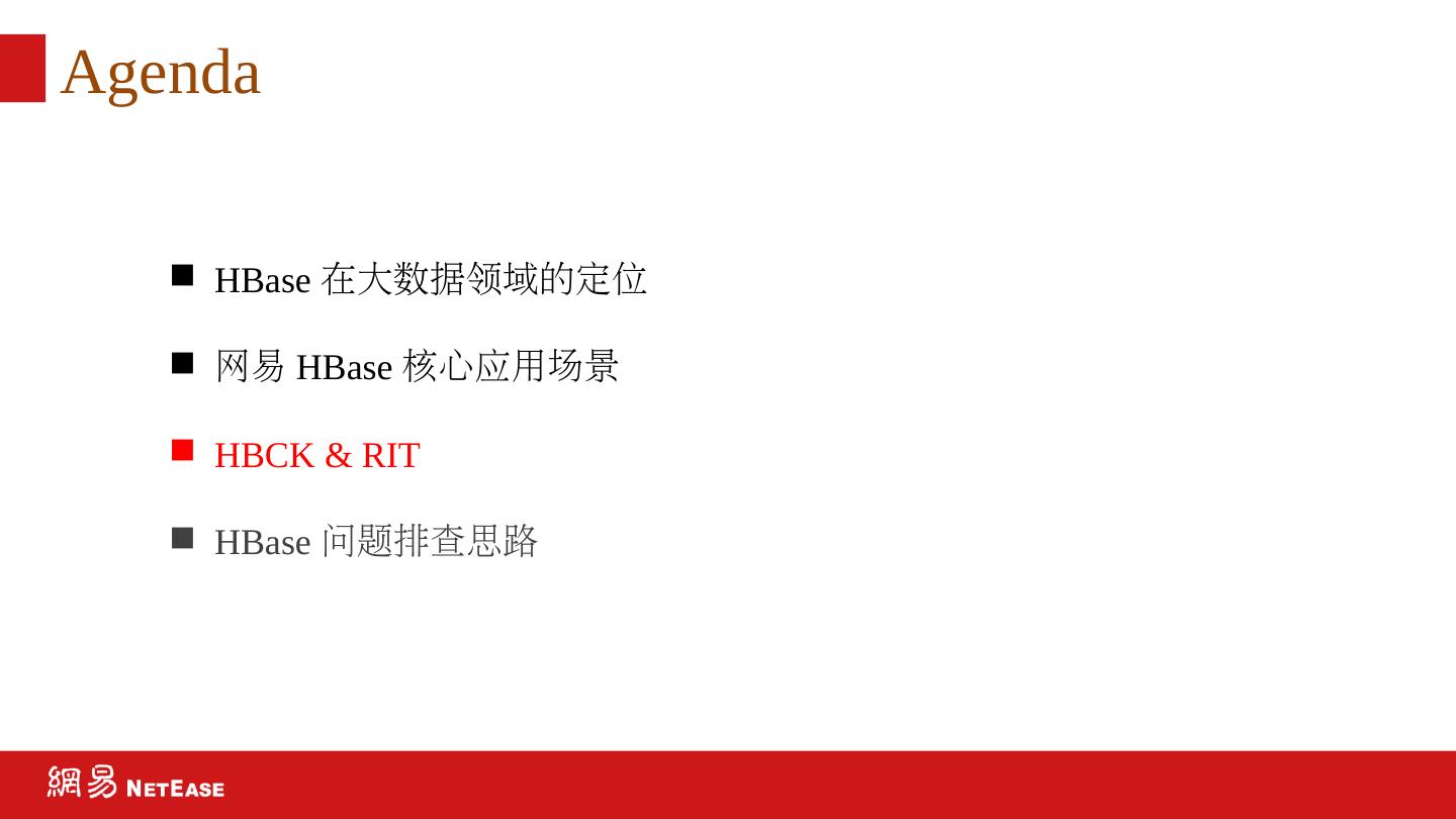24 .Agenda HBase 在大数据领域的定位 网易 HBase 核心应用场景 HBCK & RIT HBase 问题排查思路