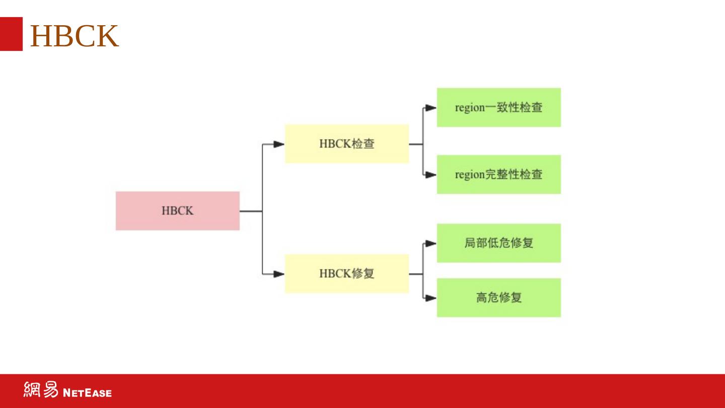 18 .HBCK - 局部低危修复 -fixAssignments : 修复没有 assign 、 assign 不正确或者同时 assign 到多台 RegionServer 的问题 region 。 -fixMeta :主要修复 .regioninfo 文件和 hbase:meta 元数据表的不一致。修复的原则是以 HDFS 文件为准:如果 region 在 HDFS 上存在,但在 hbase.meta 表中不存在,就会在 hbase:meta 表中添加一条记录。反之如果在 HDFS 上不存在,而在 hbase:meta 表中存在,就会将 hbase:meta 表中对应的记录删除。