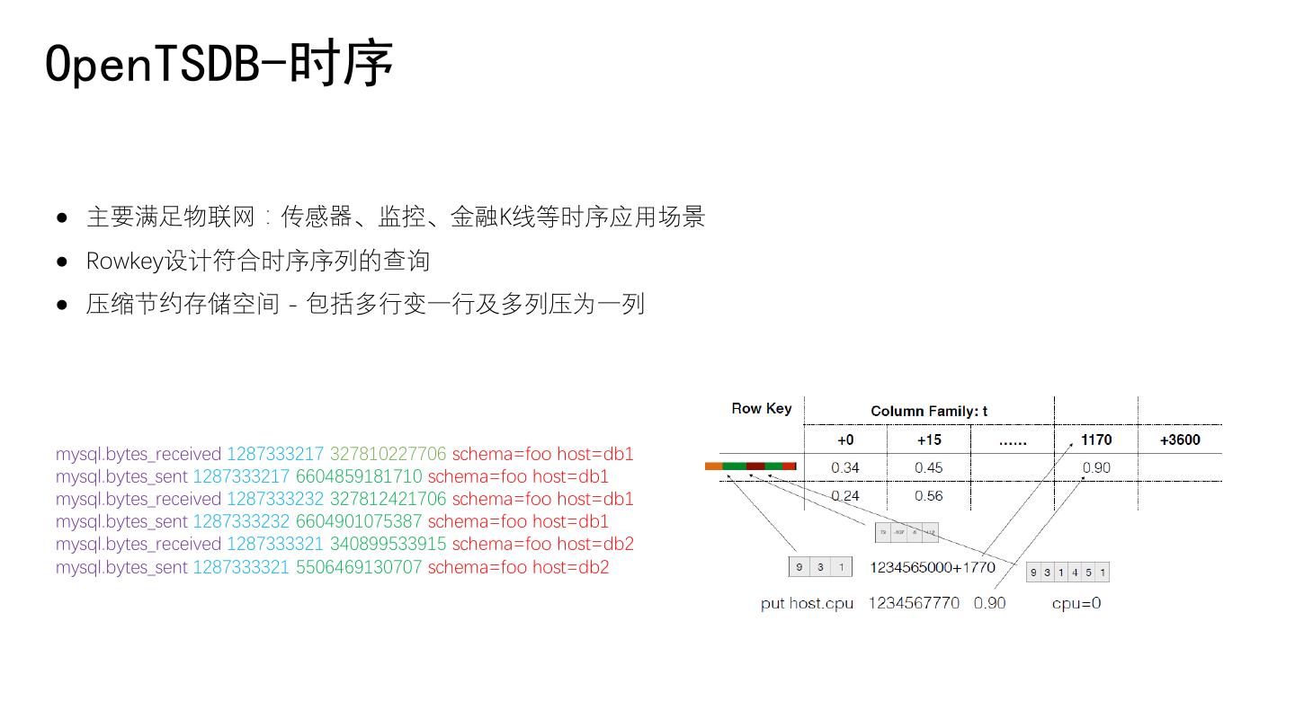 5 .OpenTSDB-时序 主要满足物联网:传感器、监控、金融K线等时序应用场景 Rowkey设计符合时序序列的查询 压缩节约存储空间 - 包括多行变一行及多列压为一列 mysql.bytes_received 1287333217 327810227706 schema=foo host=db1 mysql.bytes_sent 1287333217 6604859181710 schema=foo host=db1 mysql.bytes_received 1287333232 327812421706 schema=foo host=db1 mysql.bytes_sent 1287333232 6604901075387 schema=foo host=db1 mysql.bytes_received 1287333321 340899533915 schema=foo host=db2 mysql.bytes_sent 1287333321 5506469130707 schema=foo host=db2