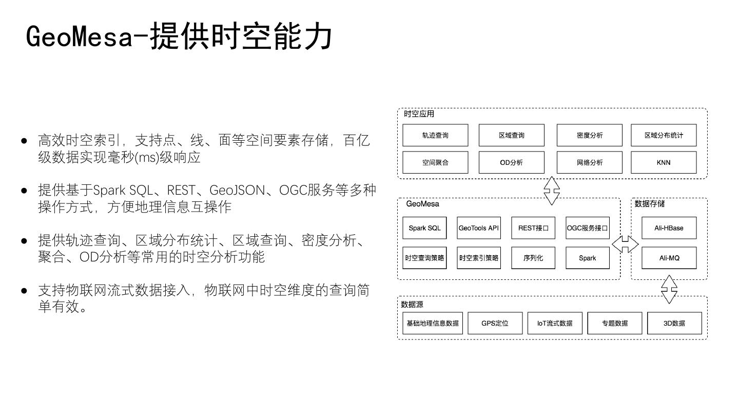 7 .GeoMesa-提供时空能力 高效时空索引,支持点、线、面等空间要素存储,百亿 级数据实现毫秒(ms)级响应 提供基于Spark SQL、REST、GeoJSON、OGC服务等多种 操作方式,方便地理信息互操作 提供轨迹查询、区域分布统计、区域查询、密度分析、 聚合、OD分析等常用的时空分析功能 支持物联网流式数据接入,物联网中时空维度的查询简 单有效。