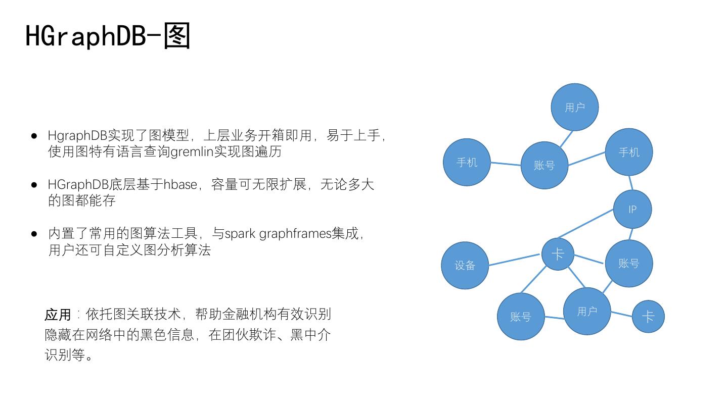8 .HGraphDB-图 用户 HgraphDB实现了图模型,上层业务开箱即用,易于上手, 使用图特有语言查询gremlin实现图遍历 手机 手机 账号 HGraphDB底层基于hbase,容量可无限扩展,无论多大 的图都能存 IP 内置了常用的图算法工具,与spark graphframes集成, 用户还可自定义图分析算法 卡 设备 账号 应用:依托图关联技术,帮助金融机构有效识别 用户 账号 卡 隐藏在网络中的黑色信息,在团伙欺诈、黑中介 识别等。