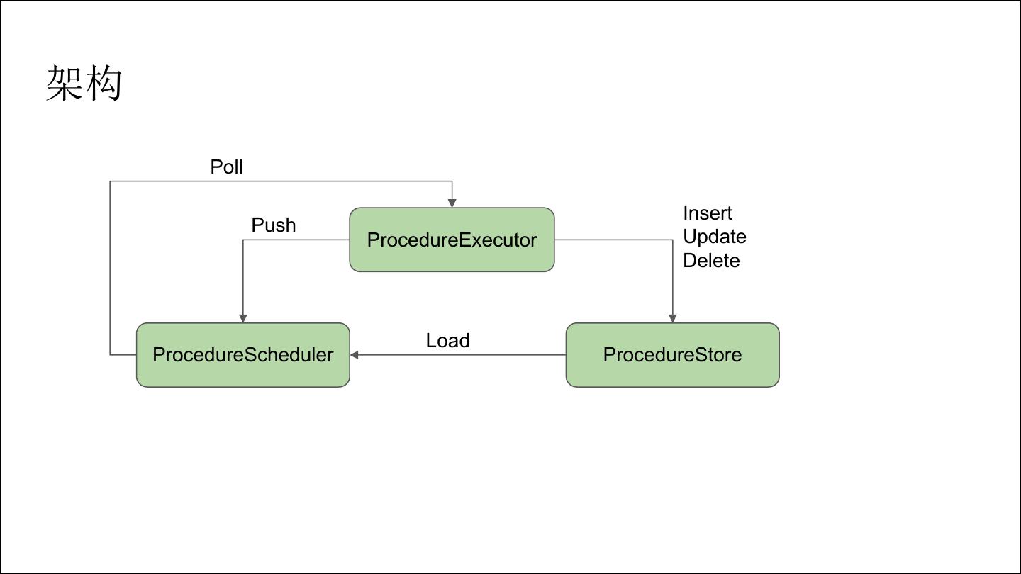 2 .架构 Poll Insert Push ProcedureExecutor Update Delete Load ProcedureScheduler ProcedureStore