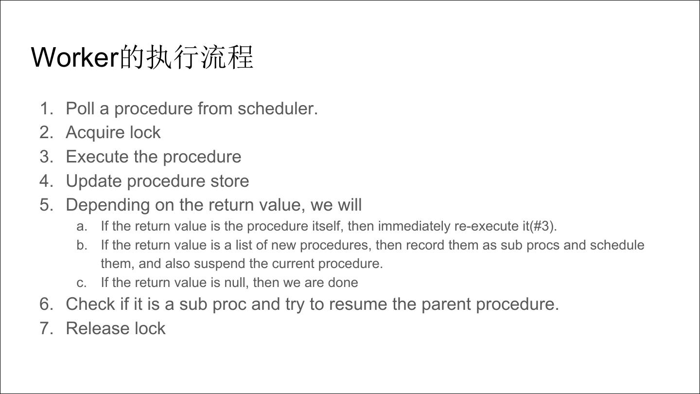 4 .Worker的执行流程 1. Poll a procedure from scheduler. 2. Acquire lock 3. Execute the procedure 4. Update procedure store 5. Depending on the return value, we will a. If the return value is the procedure itself, then immediately re-execute it(#3). b. If the return value is a list of new procedures, then record them as sub procs and schedule them, and also suspend the current procedure. c. If the return value is null, then we are done 6. Check if it is a sub proc and try to resume the parent procedure. 7. Release lock