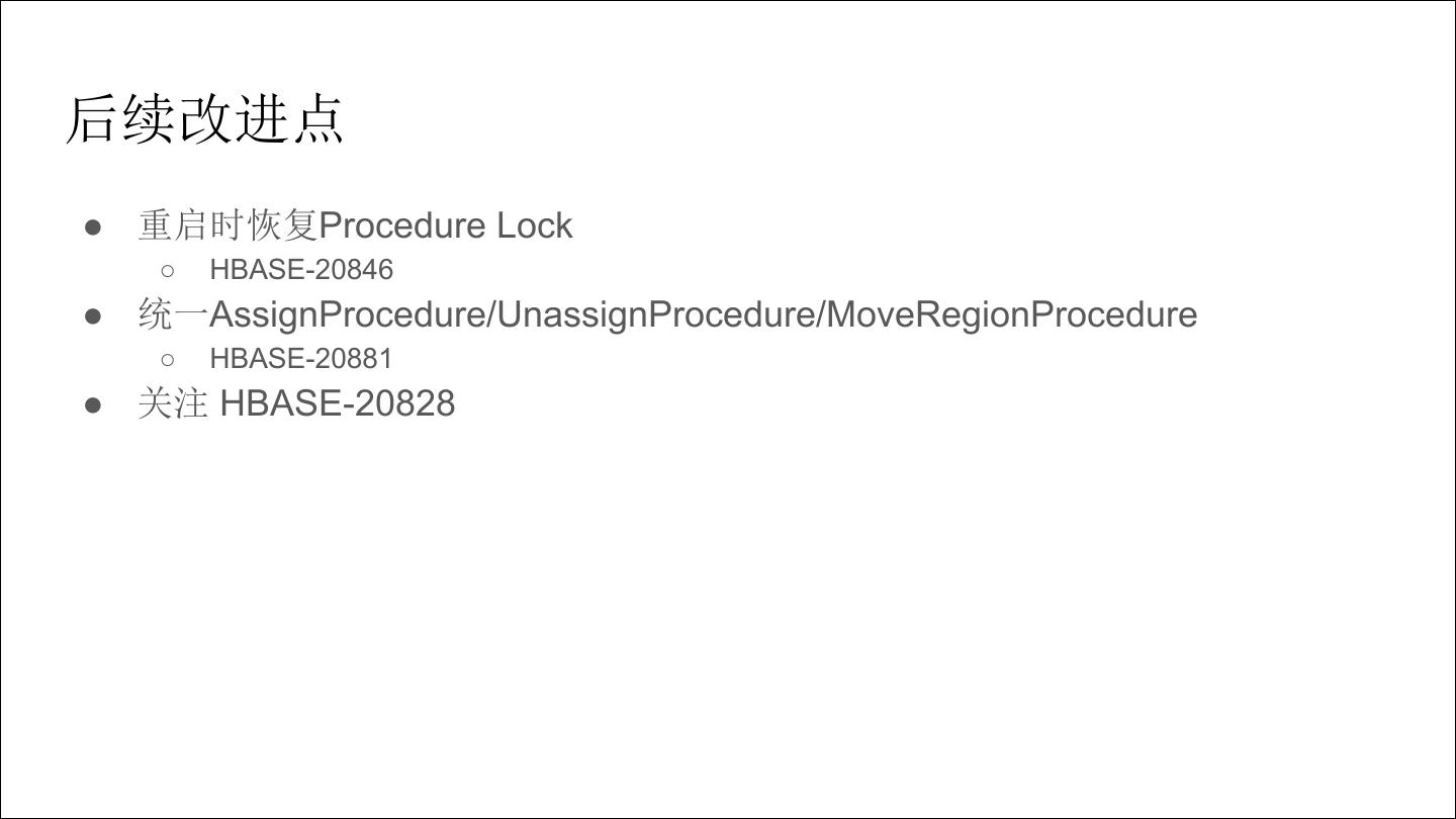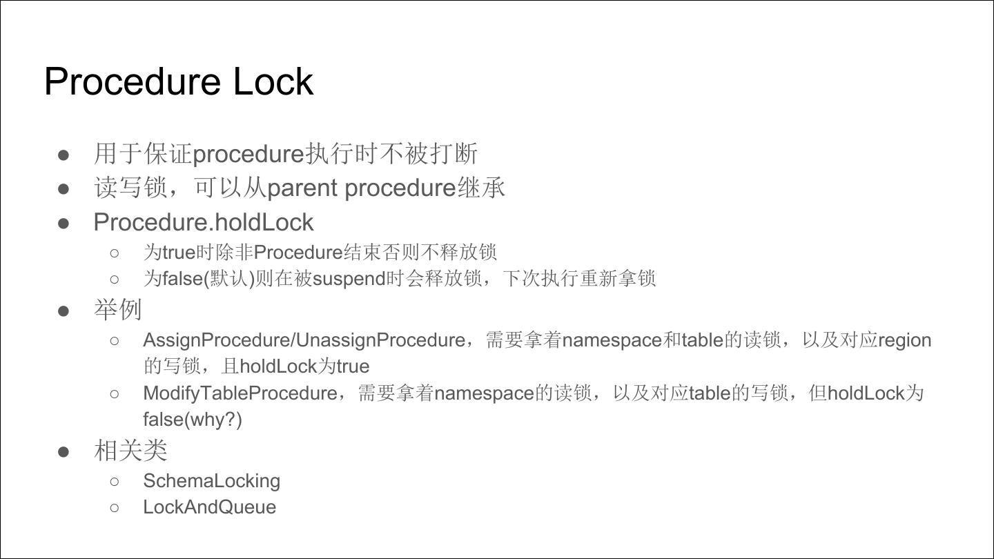 5 .Procedure Lock ● 用于保证procedure执行时不被打断 ● 读写锁,可以从parent procedure继承 ● Procedure.holdLock ○ 为true时除非Procedure结束否则不释放锁 ○ 为false(默认)则在被suspend时会释放锁,下次执行重新拿锁 ● 举例 ○ AssignProcedure/UnassignProcedure,需要拿着namespace和table的读锁,以及对应region 的写锁,且holdLock为true ○ ModifyTableProcedure,需要拿着namespace的读锁,以及对应table的写锁,但holdLock为 false(why?) ● 相关类 ○ SchemaLocking ○ LockAndQueue
