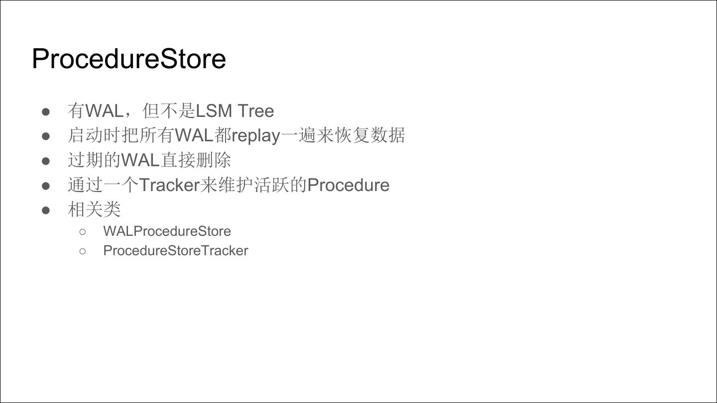 7 .ProcedureStore ● 有WAL,但不是LSM Tree ● 启动时把所有WAL都replay一遍来恢复数据 ● 过期的WAL直接删除 ● 通过一个Tracker来维护活跃的Procedure ● 相关类 ○ WALProcedureStore ○ ProcedureStoreTracker
